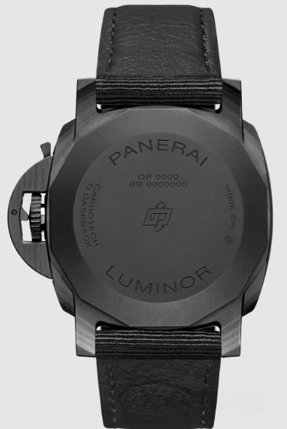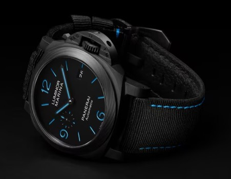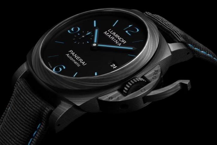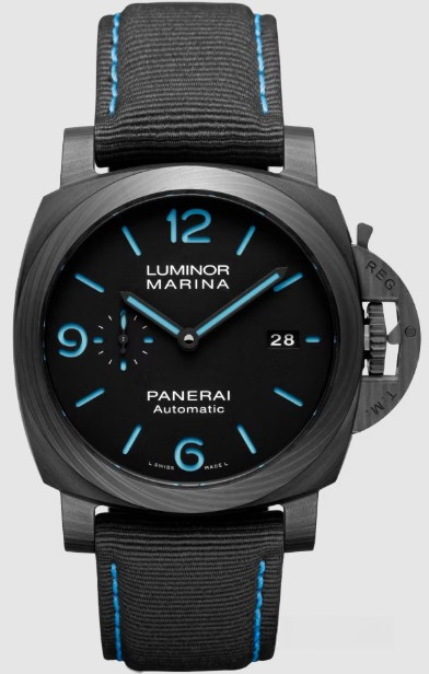Часы Officine Panerai Luminor Marina 44 mm представлены в корпусе из Carbotech размером 44 х 15.65 мм, водонепроницаемость до 300 метров. Внутри корпуса установлен автоматический механизм, Калибр P.9010 с запасом хода 3 дня. На черном циферблате отображаются часы, минуты, секунды, дата. Часы комплектуются текстильным ремешком с застежкой из нержавеющей стали.
