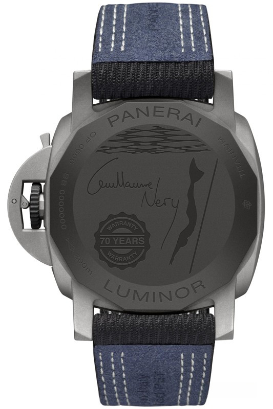 Часы Officine Panerai Luminor Marina 44 mm Guillaume Nery Edition представлены в корпусе из титана с покрытием DMLS размером 44 х 16.2 мм с водонепроницаемостью до 300 метров. Внутри корпуса установлен автоматический механизм, Калибр P.9010, обладающий запасом хода 3 дня. На черном циферблате отображаются часы, минуты, секунды, дата. Часы комплектуются текстильным ремешком с вставкой из титана. Серия ограничена - 70 шт.