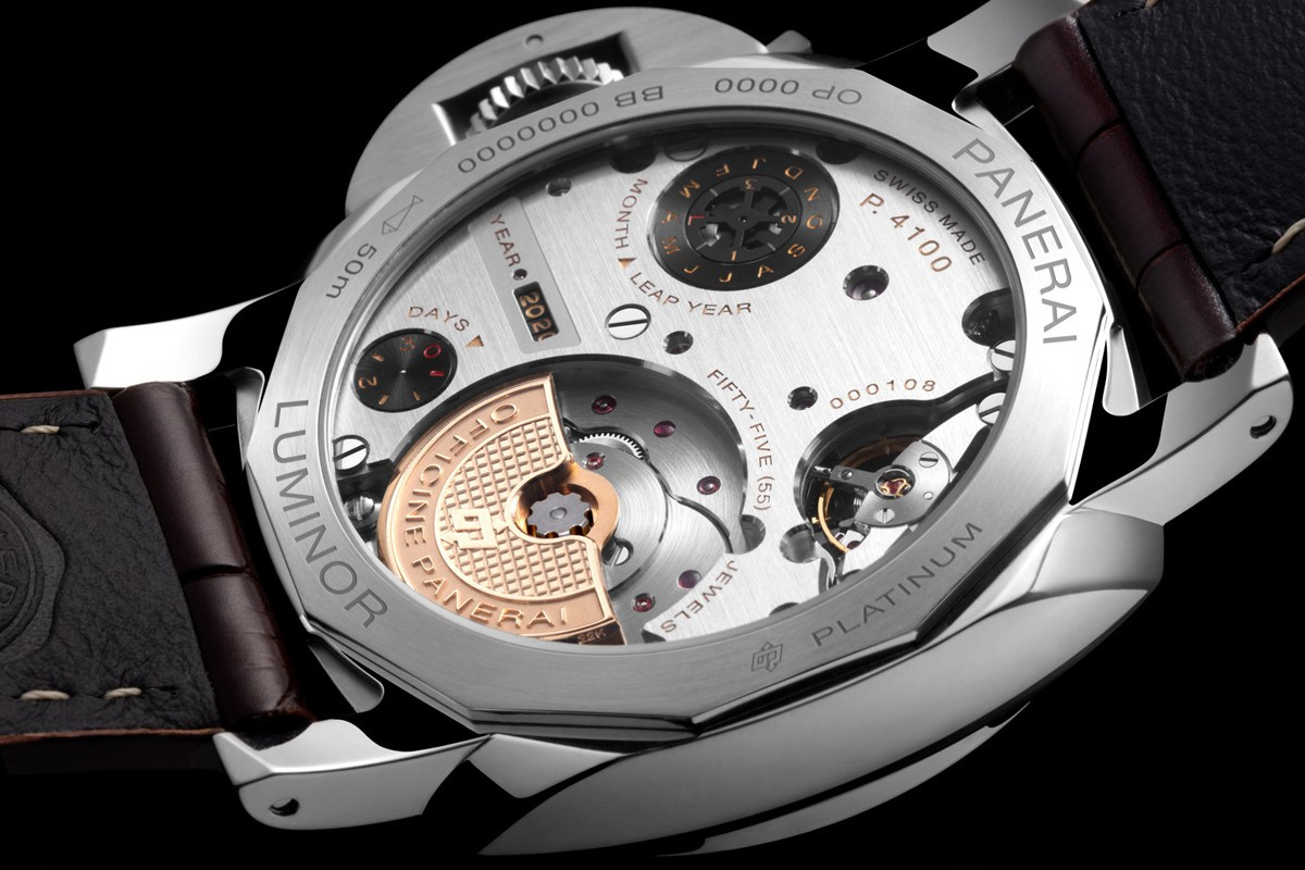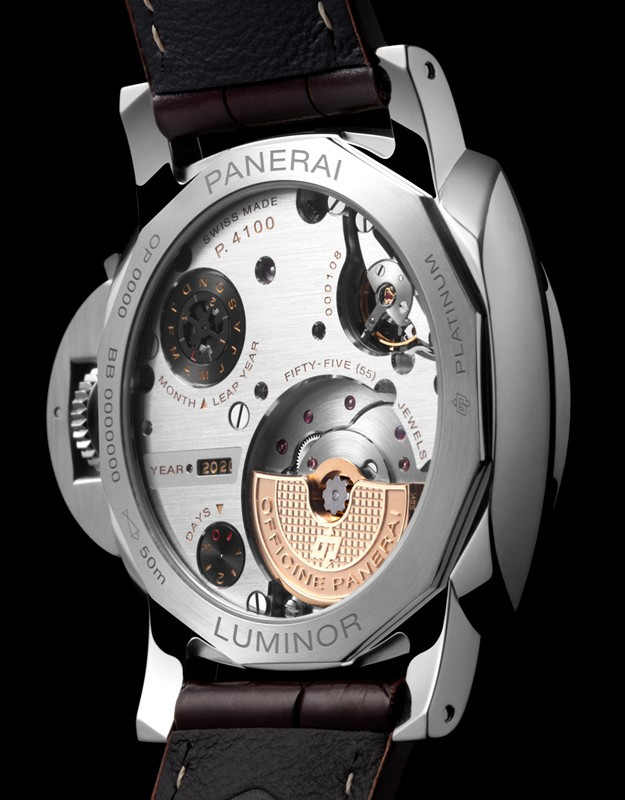 Часы Officine Panerai Perpetual Calendar 44 mm представлены в корпусе из платины 950 размером 44 мм водонепроницаемостью 50 метров. Внутри корпуса находится автоматический механизм, Калибр P.4100, обладающий запасом хода 3 дня. На черном циферблате отображаются часы, минуты, секунды, дата, день недели, месяц, год, индикатор день/ночь, запас хода. Часы поставляются на ремешке из кожи аллигатора с вставкой из платины 950. Серия ограничена - 100 шт.