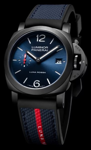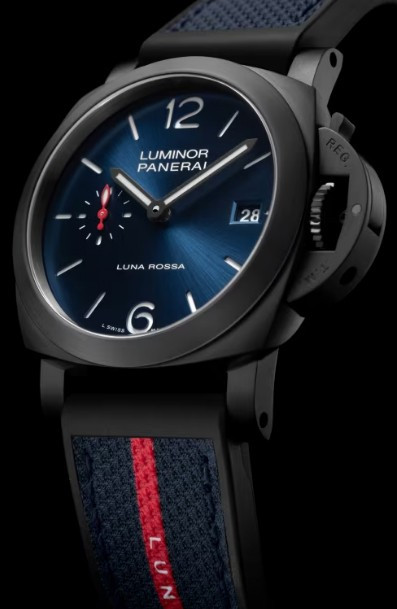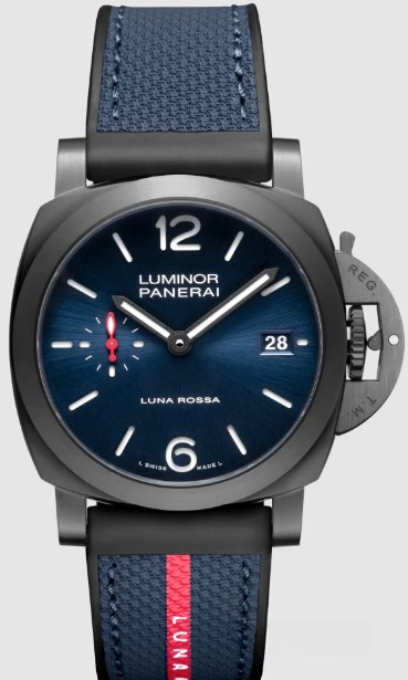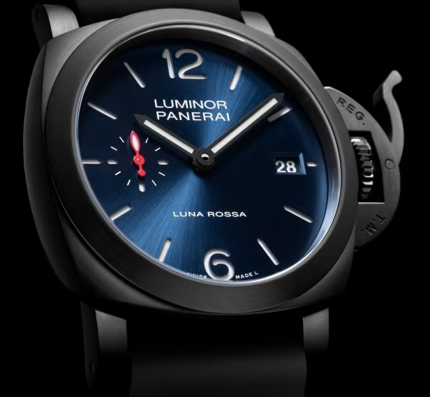 Часы Officine Panerai Luminor Quaranta представлены в корпусе размером 40 мм из нержавеющей стали с покрытием DLC водонепроницаемостью 100 метров. Внутри корпуса установлен автоматический механизм, Калибр P.900, обладающий запасом хода 3 дня. На синем циферблате отображаются часы, минуты, секунды, дата. Часы поставляются на текстильном ремешке с застежкой из нержавеющей стали.