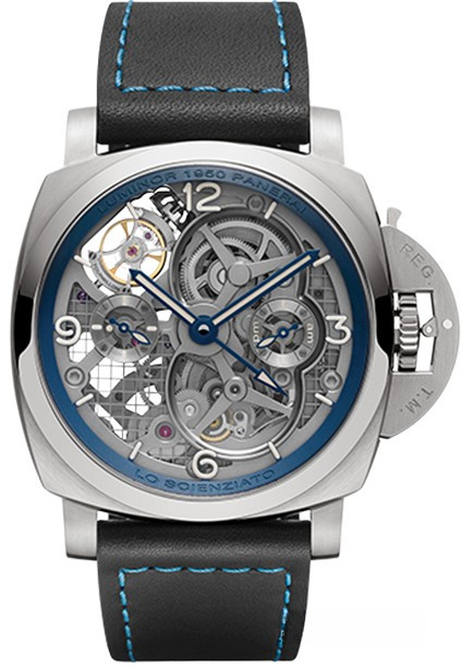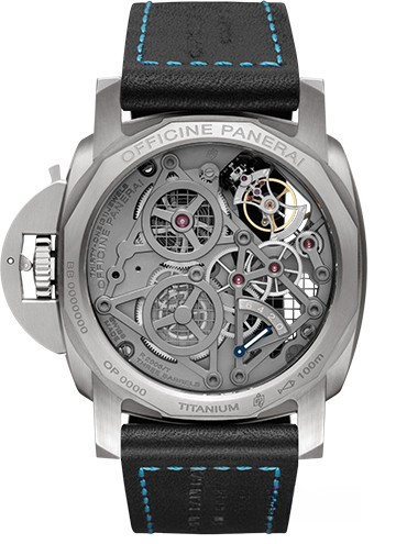 Часы с турбийоном комплектуются скелетонизированным механизмом с ручным подзаводом, Калибр P.2005/T, полностью изготовленным Panerai. На циферблате отображаются часы, минуты, малая секундная стрелка, время во втором часовом поясе, индикатор 24 ч, индикатор запаса хода на задней крышке, турбийон. Корпус диаметром 47 мм изготовлен из матового титана. Запас хода составляет 144 ч. Водонепроницаемость до 100 метров. Серия ограничена - 100 штук.