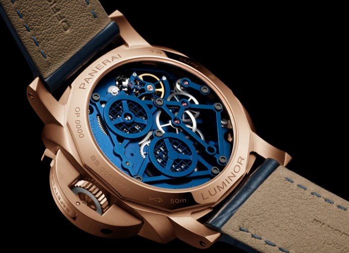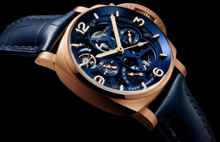 Часовая мануфактура Panerai представила Luminor Tourbillon GMT. Корпус диаметром 47 мм из розового золота 18к. Внутри корпуса находится Калибр P.2005/T. Центральными стрелками отображаются часы, минуты и время второго часового пояса. Маленькая секундная стрелка и 24-часовой индикатор расположены соответственно на 9-ти и 3-х часах. Запас хода механизма впервые отображается на лицевой стороне часов. Механизм с ручным заводом обеспечивает 6 дней запаса хода благодаря трем пружинным барабанам. Среди других выдающихся особенностей Калибра P.2005/T является нетрадиционный 30-секундный турбийон, вращающийся вокруг оси, перпендикулярной оси колеса баланса. Panerai Luminor Tourbillon GMT поставляется на ремешке из кожи аллигатора с золотой вставкой.