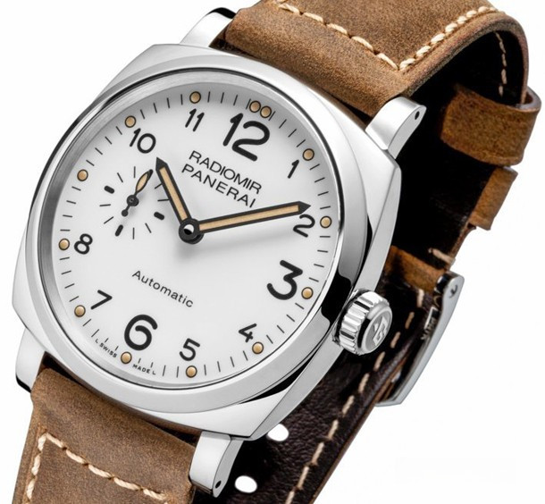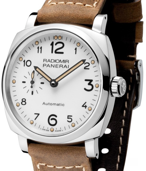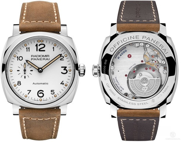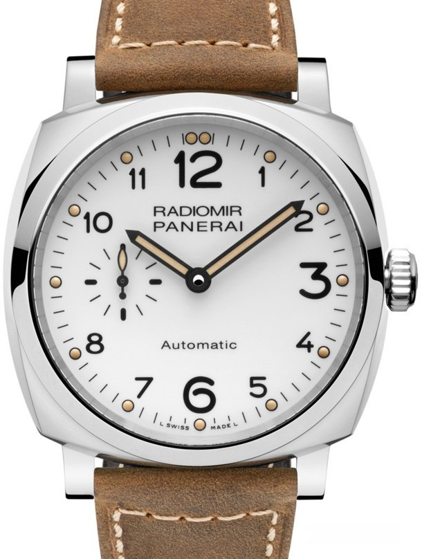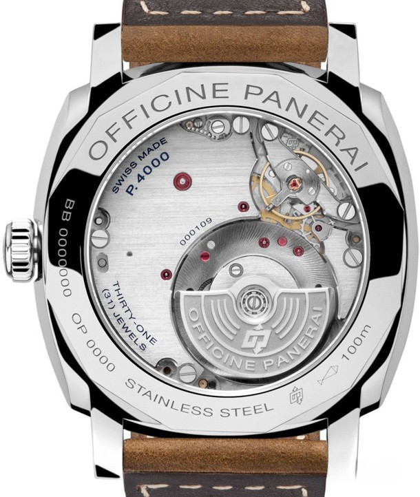 Часы Radiomir 1940 3 Days Acciaio (реф. PAM 00655) диаметром 42 мм представлены в корпусе из полированной стали 316L. Подушкообразная форма корпуса идеально охватывает запястье. Укомплектованы часы ремешком коричневого цвета из кожи теленка с классической застежкой из нержавеющей стали. Данная новинка оснащена мануфактурным часовым механизмом с автоматическим заводом, с 3-дневным запаса хода. Владелец может насладится отделкой сквозь прозрачное заднее стекло из сапфира. Циферблат белого цвета со светящимися арабскими цифрами и часовыми метками (покрытие Super-LumiNova бежевого цвета, в том числе и центральные стрелки). Отдельно было отведено место малому секундному счетчику на «9 часах». Водонепроницаемость до 100 метров.