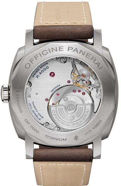 Модель Radiomir 1940 оснащена классическим корпусом в форме большой подушки, 45 мм в диаметре. Корпус выполнен из двух различных видов титана: задняя крышка корпуса выполнена из титана 2 класса - легкого сплава, устойчивого к коррозии и позволяющего осуществить сложные обработки; безель и заводная головка выполнены из титана 5-го класса - сплава, который отличается от предыдущего возможностью осуществления полировки. Водонепроницаемость корпуса до 100 м. Коричневый циферблат выполнен в характерной конструкции сэндвича, созданной Panerai в 1930 году для максимальной видимости и читаемости. Специальное покрытие Super-LumiNova® придает циферблату винтажный вид. Также напоминает о прошлом бренда характерный небольшой секундный циферблат на отметке 9 часов. Калибром P.4000 можно любоваться через сапфировое стекло задней крышки корпуса. Ротор, выполненный из вольфрама, очень мал и установлен внутри механизма вместо наложения на механизм. Он крутится в обоих направлениях, что позволяет ему накопить запас хода на три дня, благодаря использованию двух пружинных барабанов соединенных последовательно. Калибр P.4000 также имеет устройство, останавливающее баланс при вытягивании заводной головки, что позволяет идеально синхронизировать часы. Модель Radiomir 1940 3 Days Automatic Titanio (PAM 00619) оснащена ремешком из кожи буйвола коричневого цвета с контрастной строчкой.