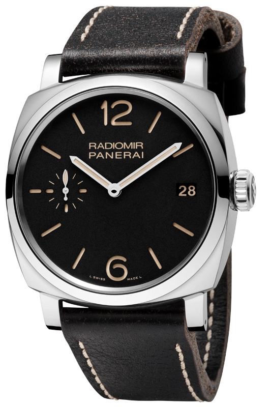 Водостойкие часы Officine Panerai Radiomir 1940 3 Days Acciaio PAM 00514 выпущены в корпусе из нержавеющей стали. Размер составляет 47 мм, водонепроницаемость 100 м. Внутри корпуса установлен механизм с ручным заводом, Калибр P.3000, обеспечивающий запас хода 3 дня. На черном циферблате отображаются часы, минуты, секунды, дата. Часы и минуты отображаются при помощи центральных стрелок, малая секундная стрелка находится на 9-ти часах, апертура даты - на 3-х. Часы комплектуются черным кожаным ремешком с вставкой из нержавеющей стали. Часы выпущены ограниченной серией 2000 шт.