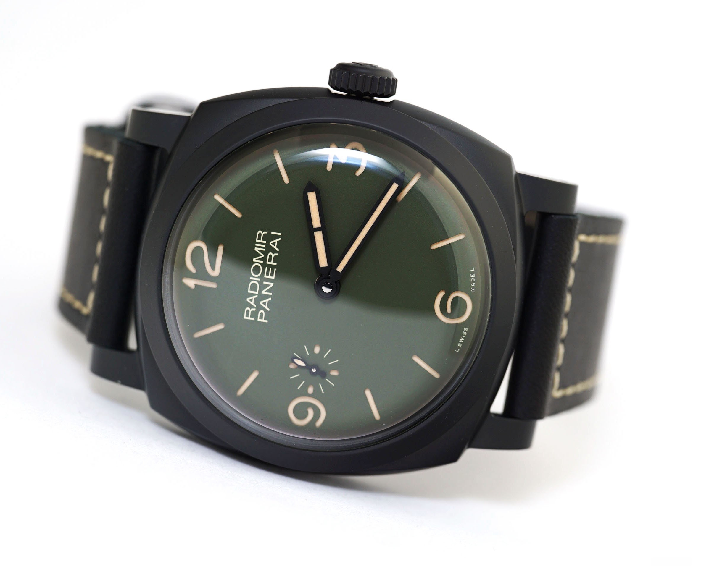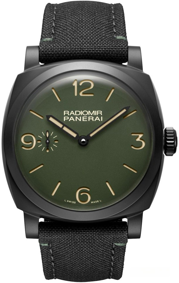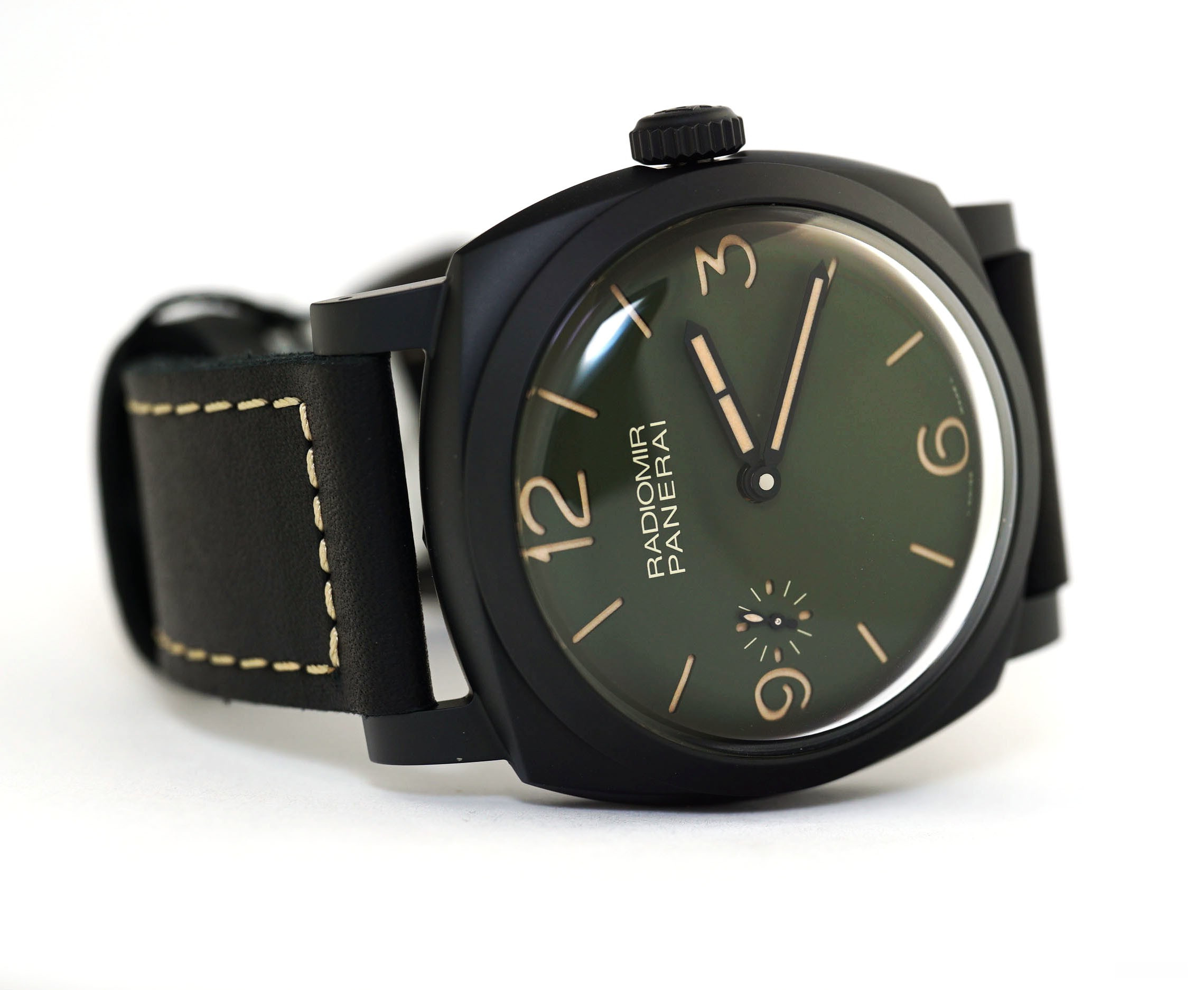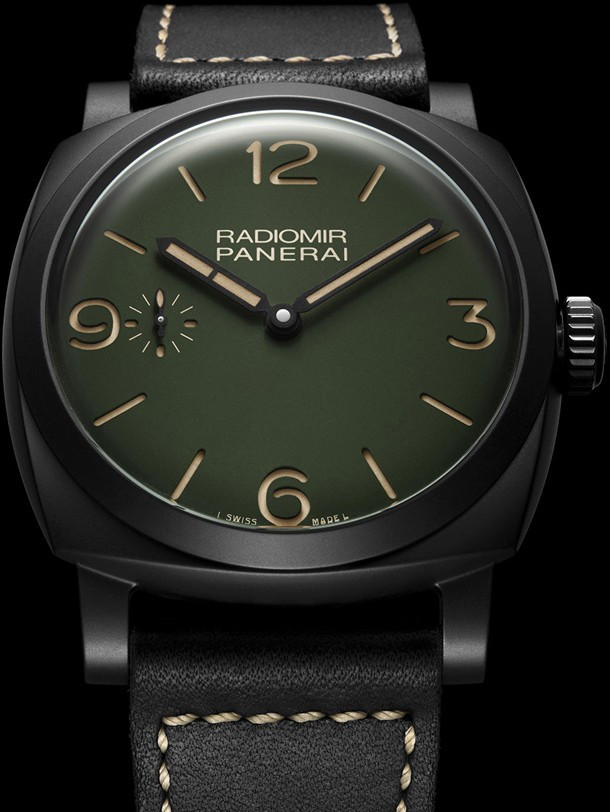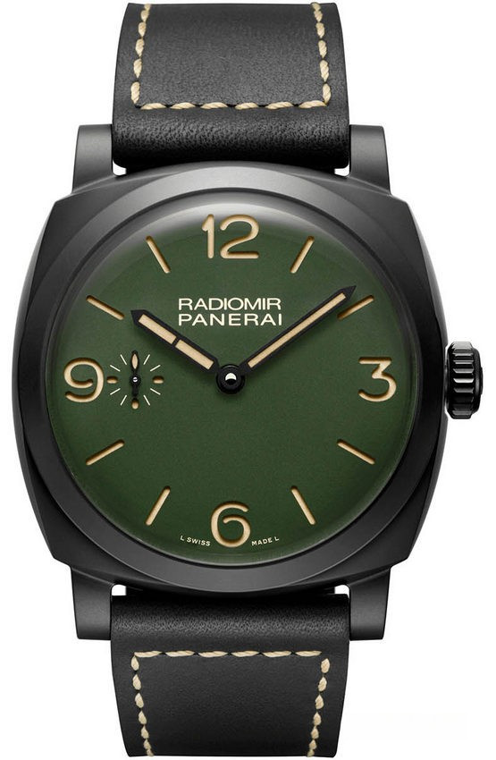 Часы Officine Panerai Radiomir Military Green Editions представлены в корпусе из керамики диаметром 48 мм и водонепроницаемостью 100 метров. Внутри корпуса установлен механизм с ручным заводом, Калибр P.3000, обладающий запасом хода 3 дня. На зеленом циферблате отображаются часы, минуты, секунды. Часы комплектуются кожаным ремешком с вставкой из нержавеющей стали.