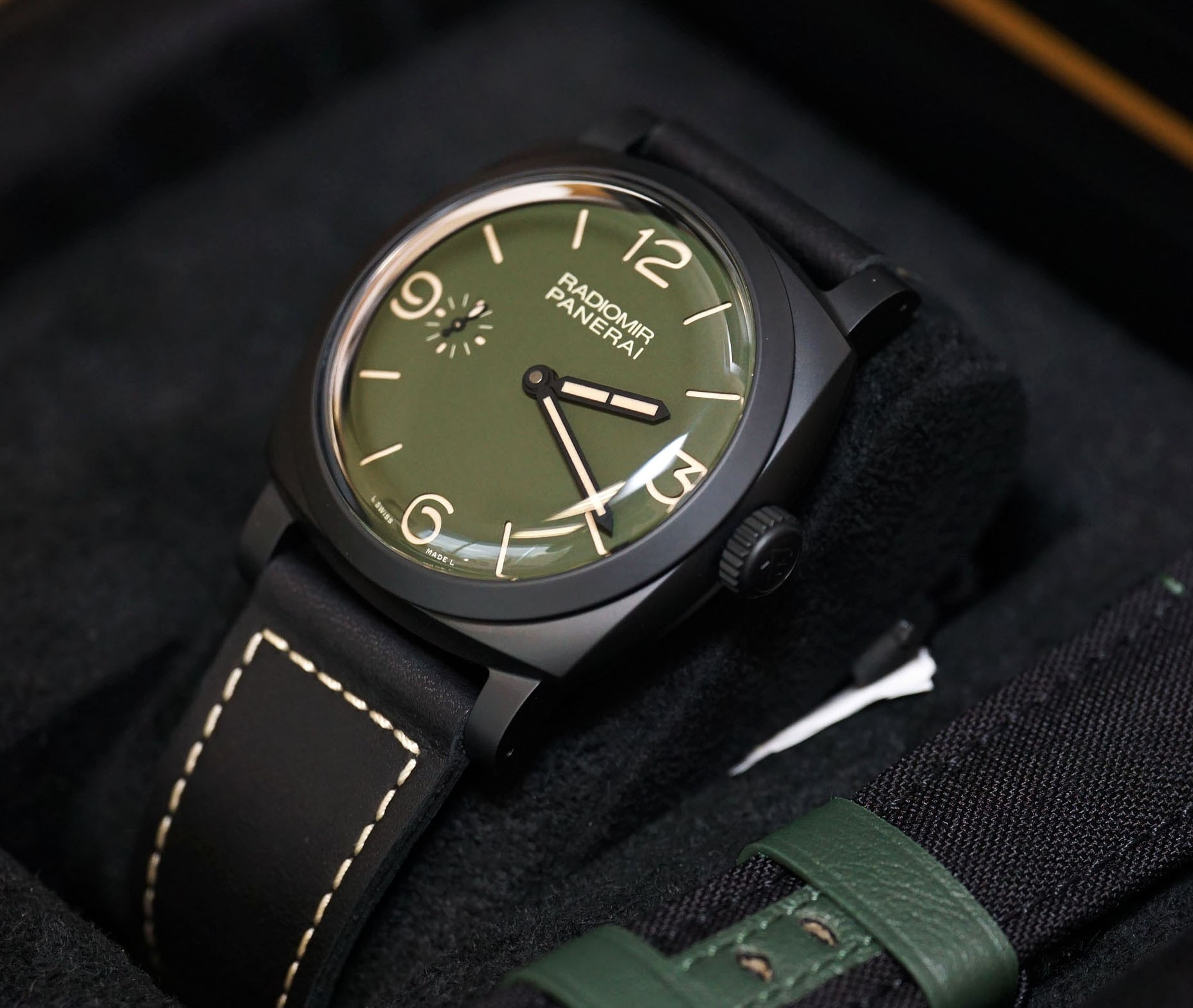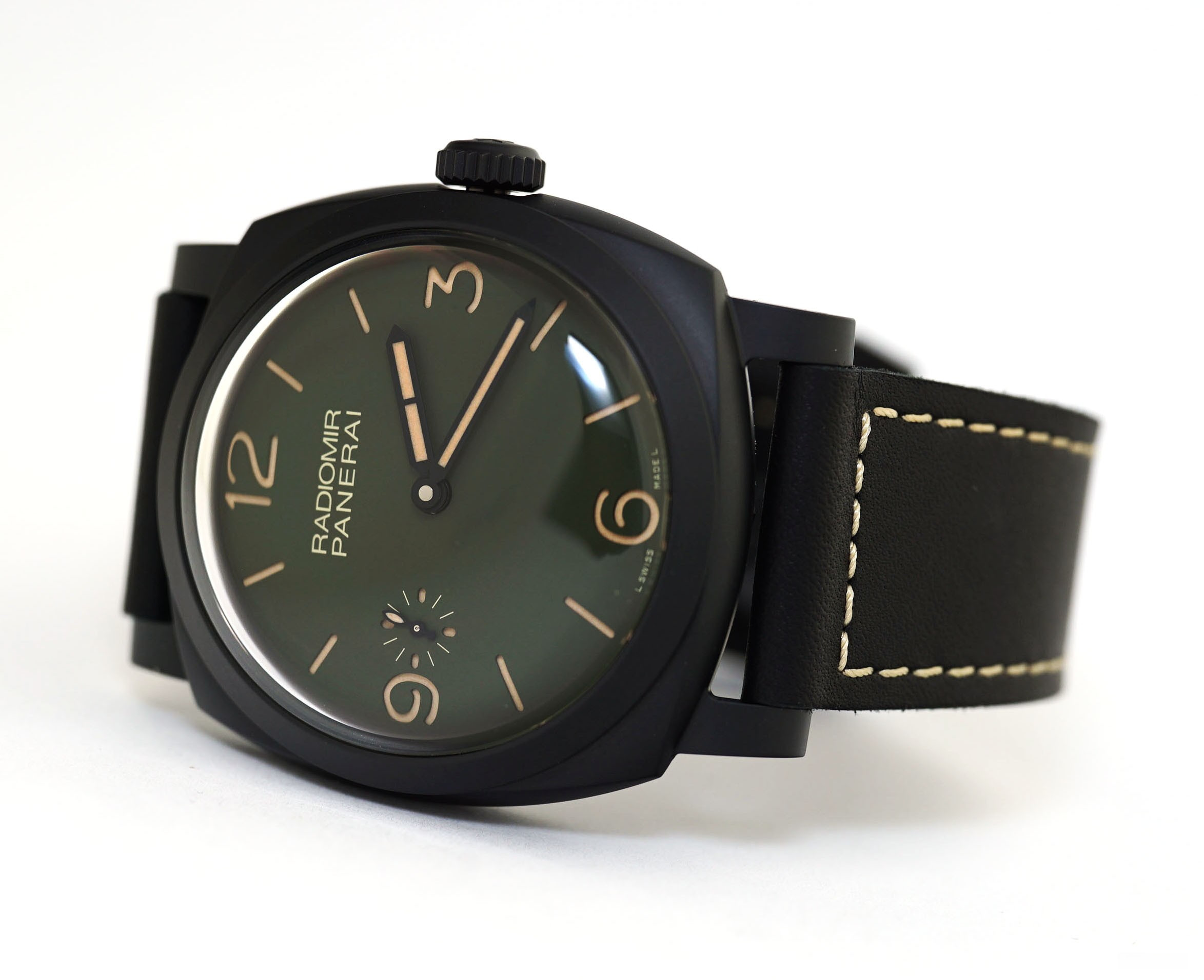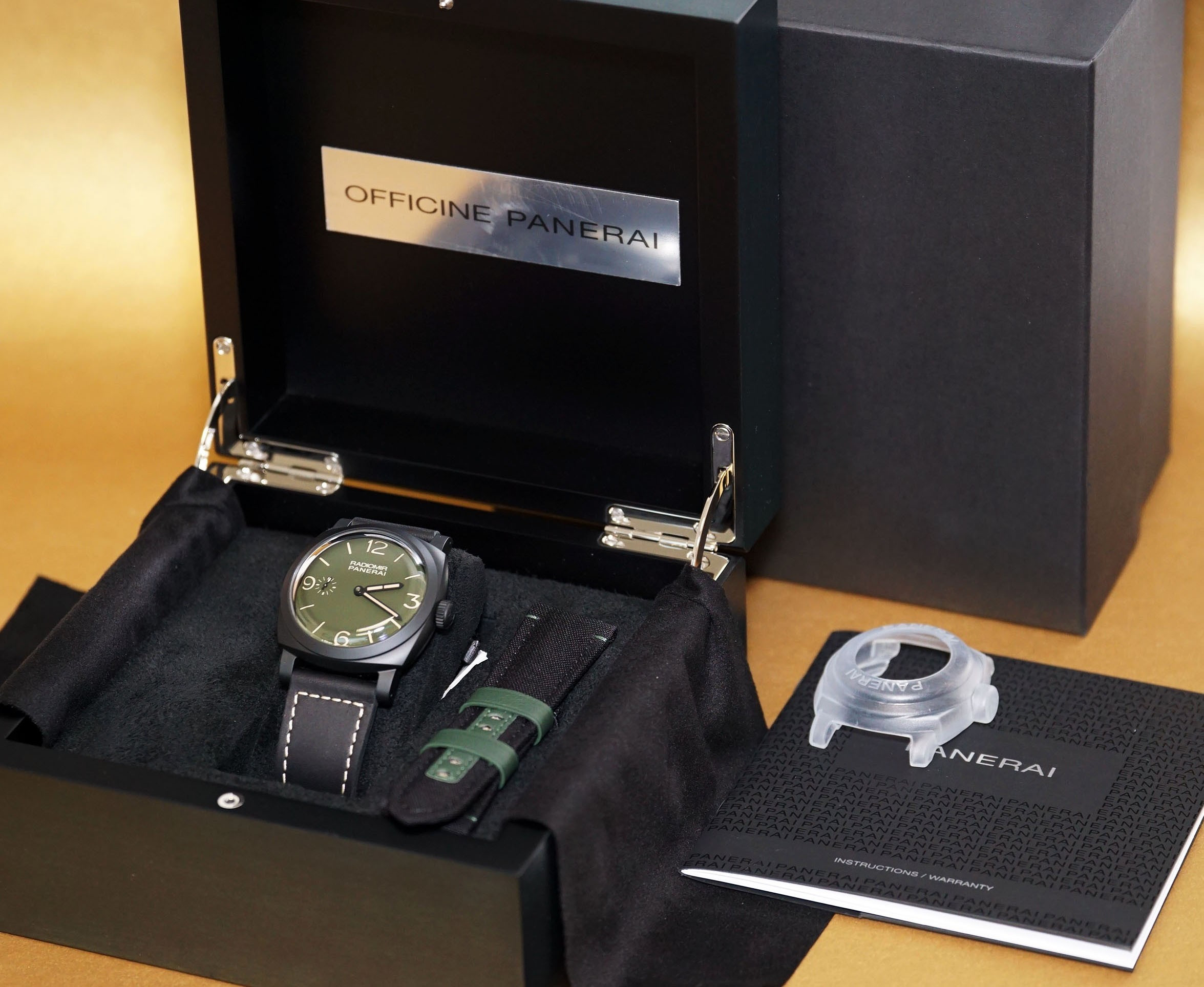 Часы Officine Panerai Radiomir Military Green Editions представлены в корпусе из керамики диаметром 48 мм и водонепроницаемостью 100 метров. Внутри корпуса установлен механизм с ручным заводом, Калибр P.3000, обладающий запасом хода 3 дня. На зеленом циферблате отображаются часы, минуты, секунды. Часы комплектуются кожаным ремешком с вставкой из нержавеющей стали.