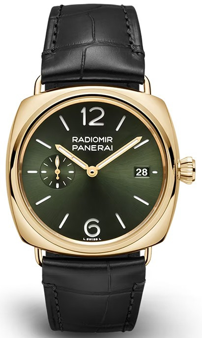 Часы Officine Panerai Radiomir Quaranta Goldtech 40 mm представлены в корпусе размером 40 х 10.15 мм из желтого золота 18к водонепроницаемостью 30 метров. Внутри корпуса установлен автоматический механизм, Калибр P.900, обладающий запасом хода 3 дня. На зеленом циферблате отображаются часы, минуты, секунды, дата. Часы поставляются на ремешке из кожи аллигатора с золотой застежкой.