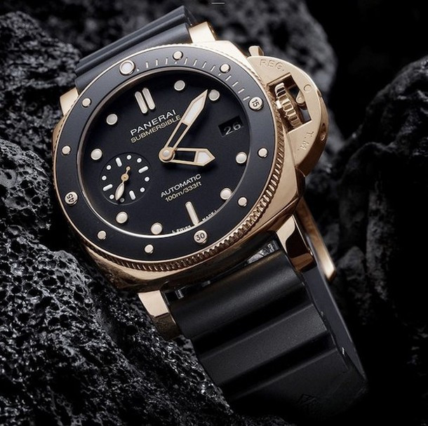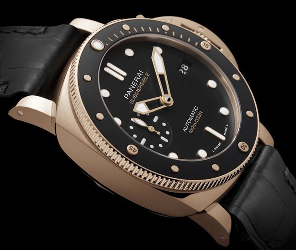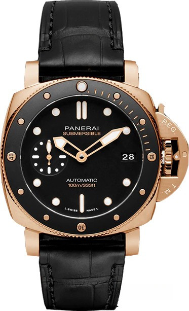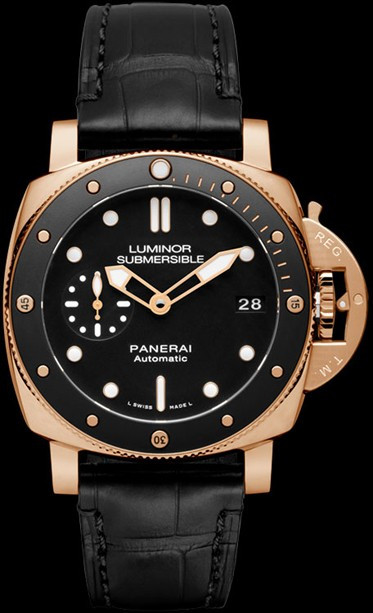 Часы Officine Panerai Luminor Submersible 42mm представлены в корпусе из розового золота 18к и керамики размером 42 мм с водонепроницаемостью 100 м. Внутри корпуса установлен автоматический механизм, Калибр OP XXXIV, обладающий запасом хода 72 часа. На черном циферблате отображаются часы, минуты, секунды и дата. Часы комплектуются ремешком из кожи аллигатора с вставкой из розового золота 18к.