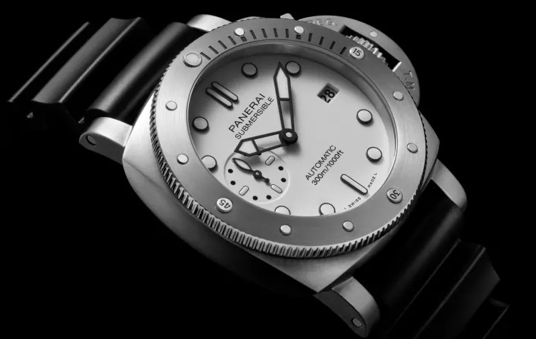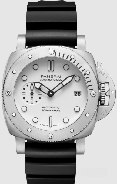 Часы Officine Panerai Luminor Submersible 42mm представлены в корпусе из нержавеющей стали размером 42 мм с водонепроницаемостью 100 м. Внутри корпуса установлен автоматический механизм, Калибр P.900, обладающий запасом хода 72 часа. На белом циферблате отображаются часы, минуты, секунды и дата. Часы комплектуются каучуковым ремешком с застежкой из нержавеющей стали.