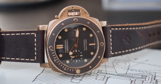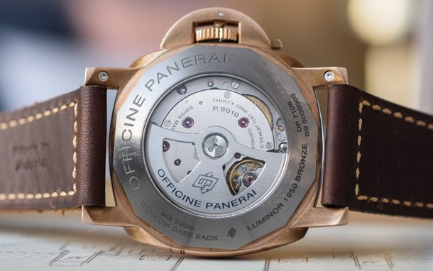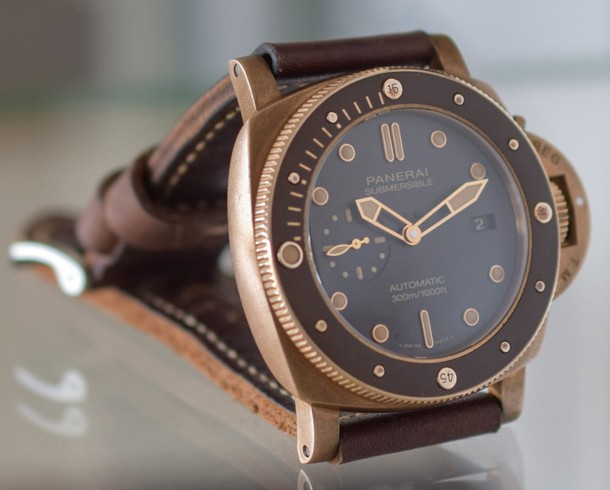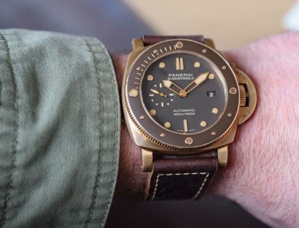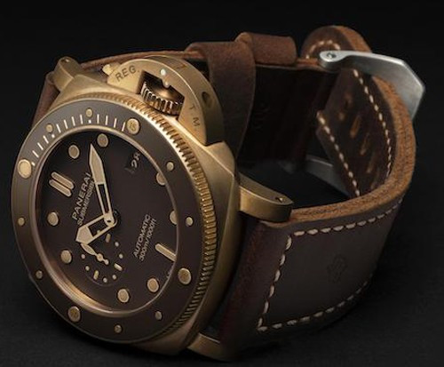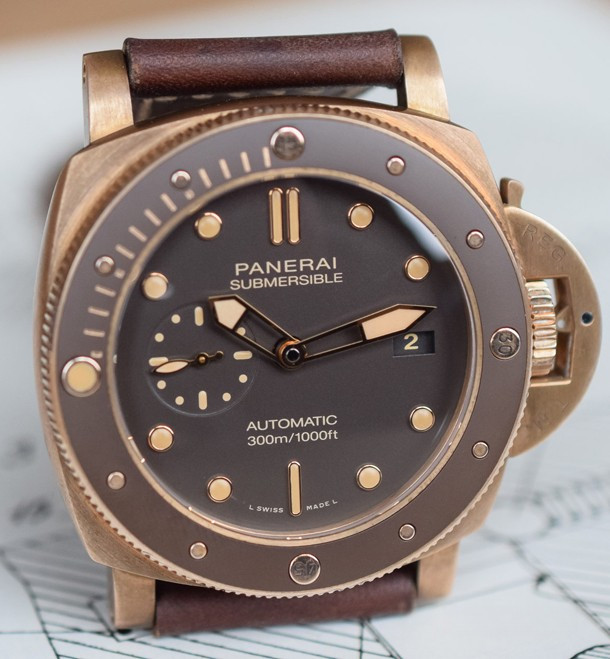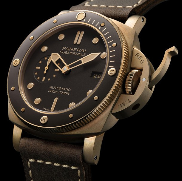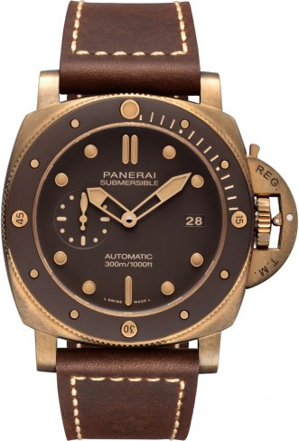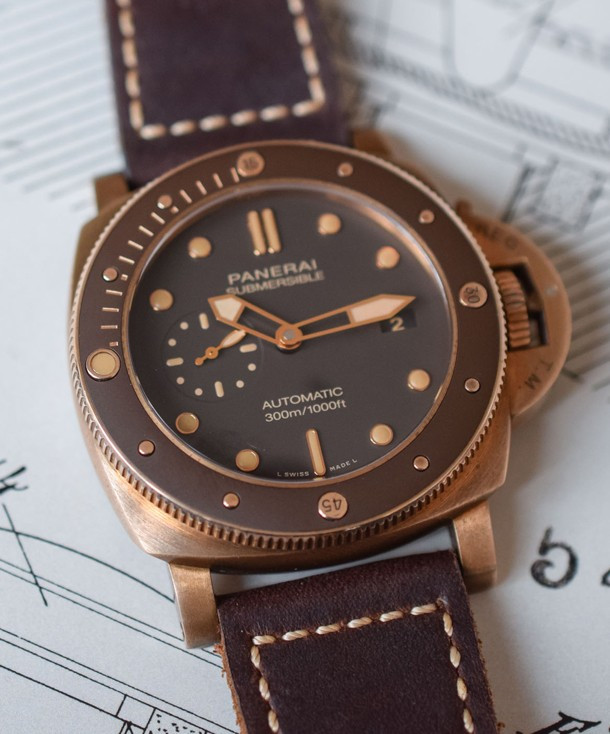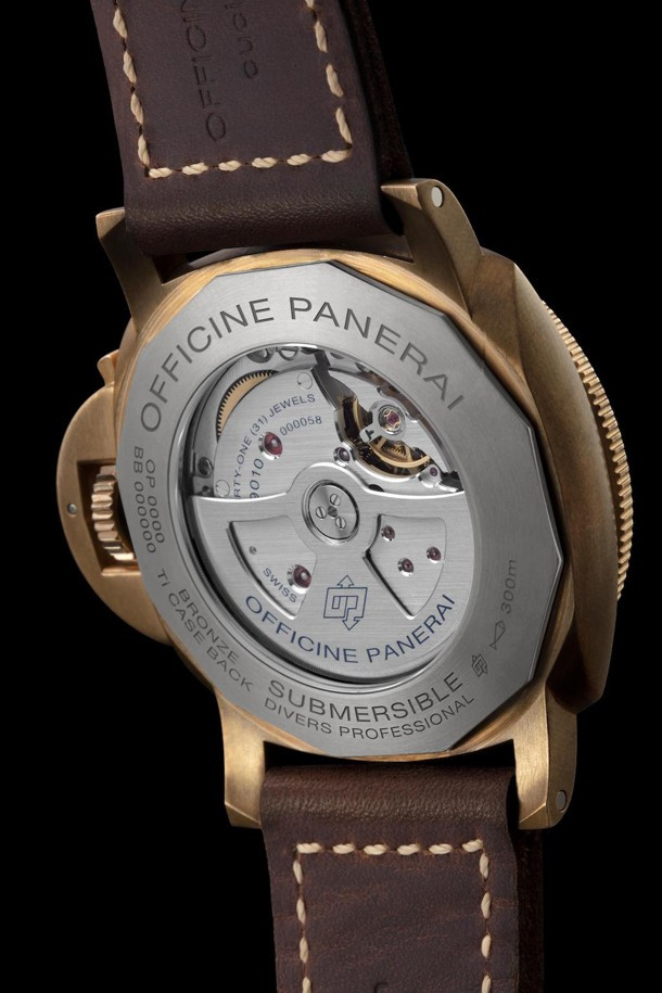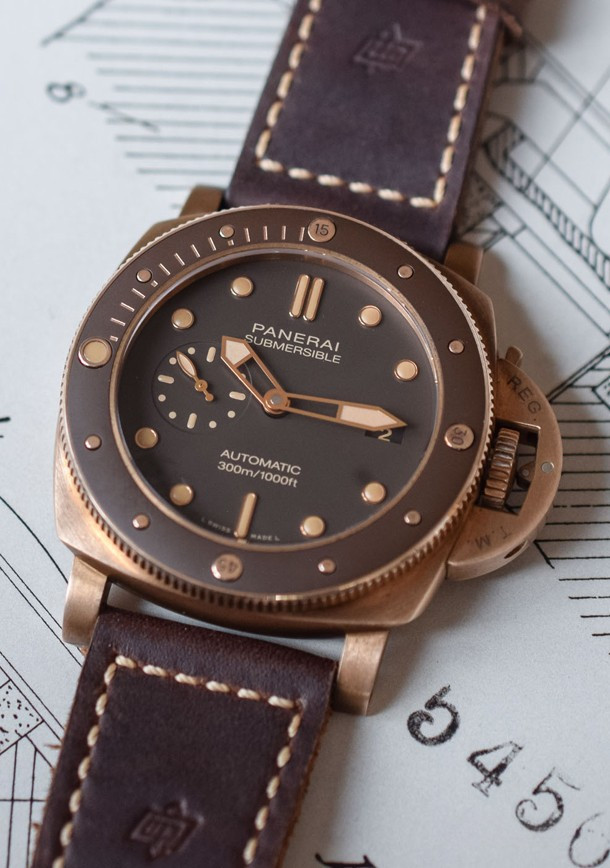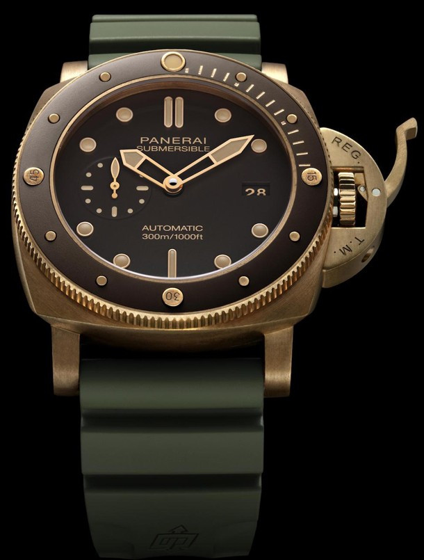 Panerai представила новую модель в бронзовом корпусе Submersible Bronzo PAM 00968. 47-миллиметровый корпус состоит из 161 грамма бронзы. Циферблат коричневого цвета имеет светящиеся часовые метки и точки в соответствующем бронзовом оттенке. Апертура даты расположена на 3-х часах, а маленькая секундная стрелка - на 9-ти часах. Внутри корпуса установлен мануфактурный Калибр P.9010, который можно найти во многих новых моделях Submersible. Автоматический механизм с балансовой частотой 28 800 пк/час обеспечивает 72-часовой запас хода. Panerai Submersible Bronzo обладает водонепроницаемостью до 300 м. Механизм виден через сапфировое стекло на задней крышке корпуса. Сама задняя крышка изготовлена из титана. Часы поставляются на коричневом кожаном ремешке с контрастной бежевой строчкой и титановой ставкой.