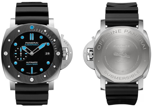 Часы Officine Panerai Luminor Submersible BMG-TECH 47mm представлены в корпусе из титанового сплава BMG-TECH размером 47 мм и водонепроницаемостью 300 м, вращающийсябезель. Внутри корпуса установлен автоматический механизм, Калибр Panerai P.9010, обладающий запасом хода 72 часа. На черном циферблате отображаются часы, минуты, секунды и дата. Часы комплектуются каучуковым ремешком с титановой вставкой.