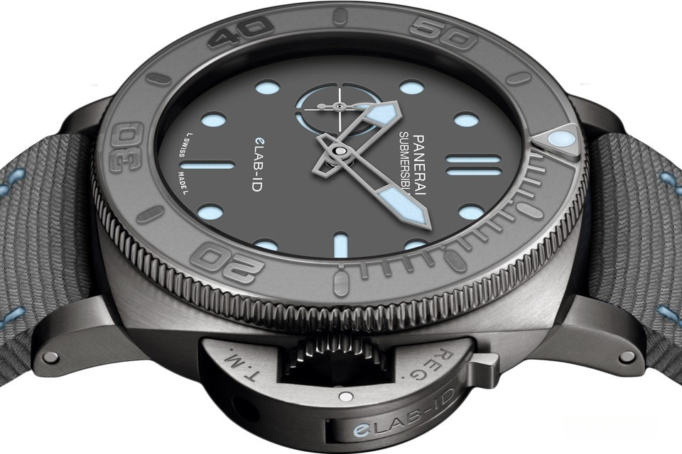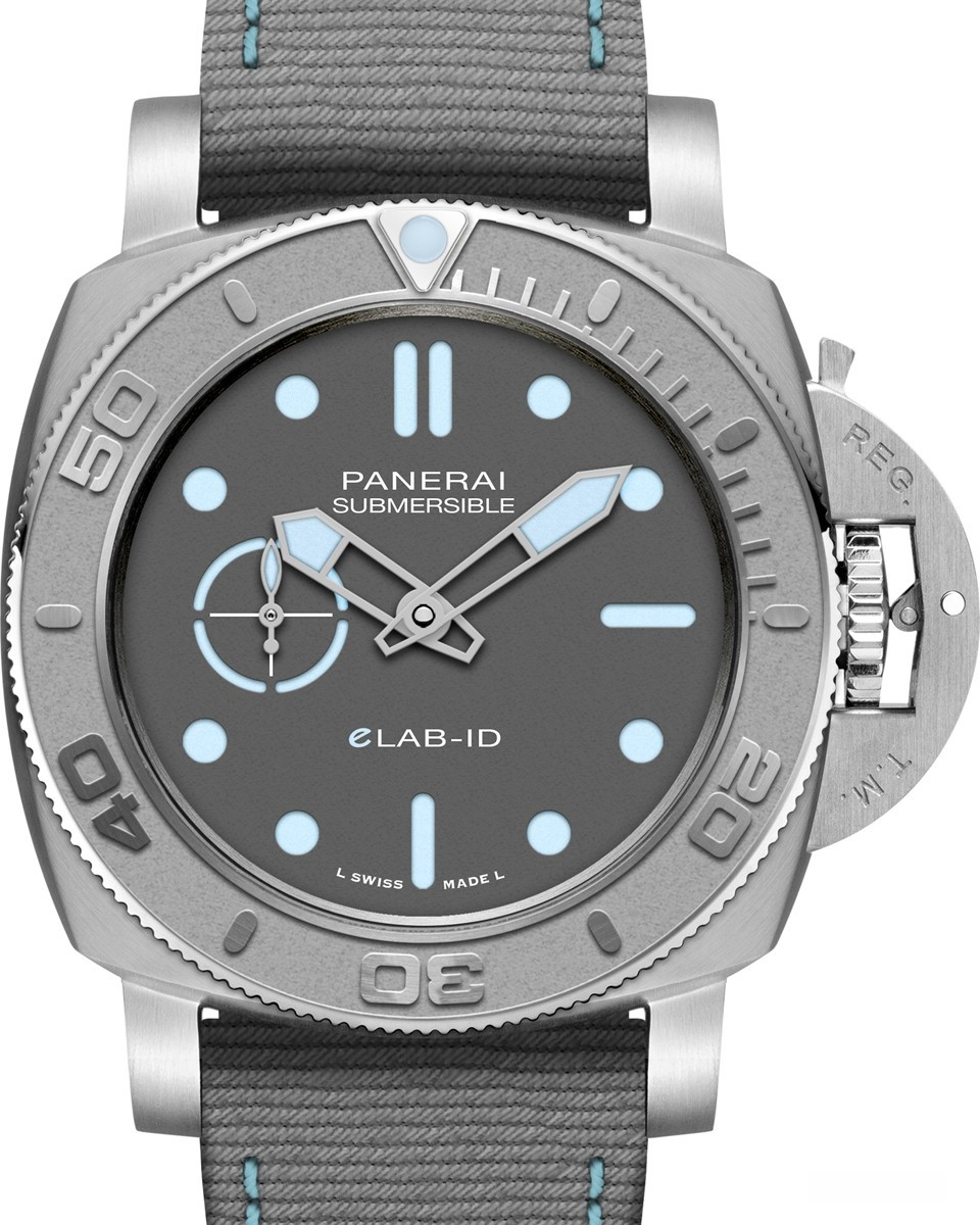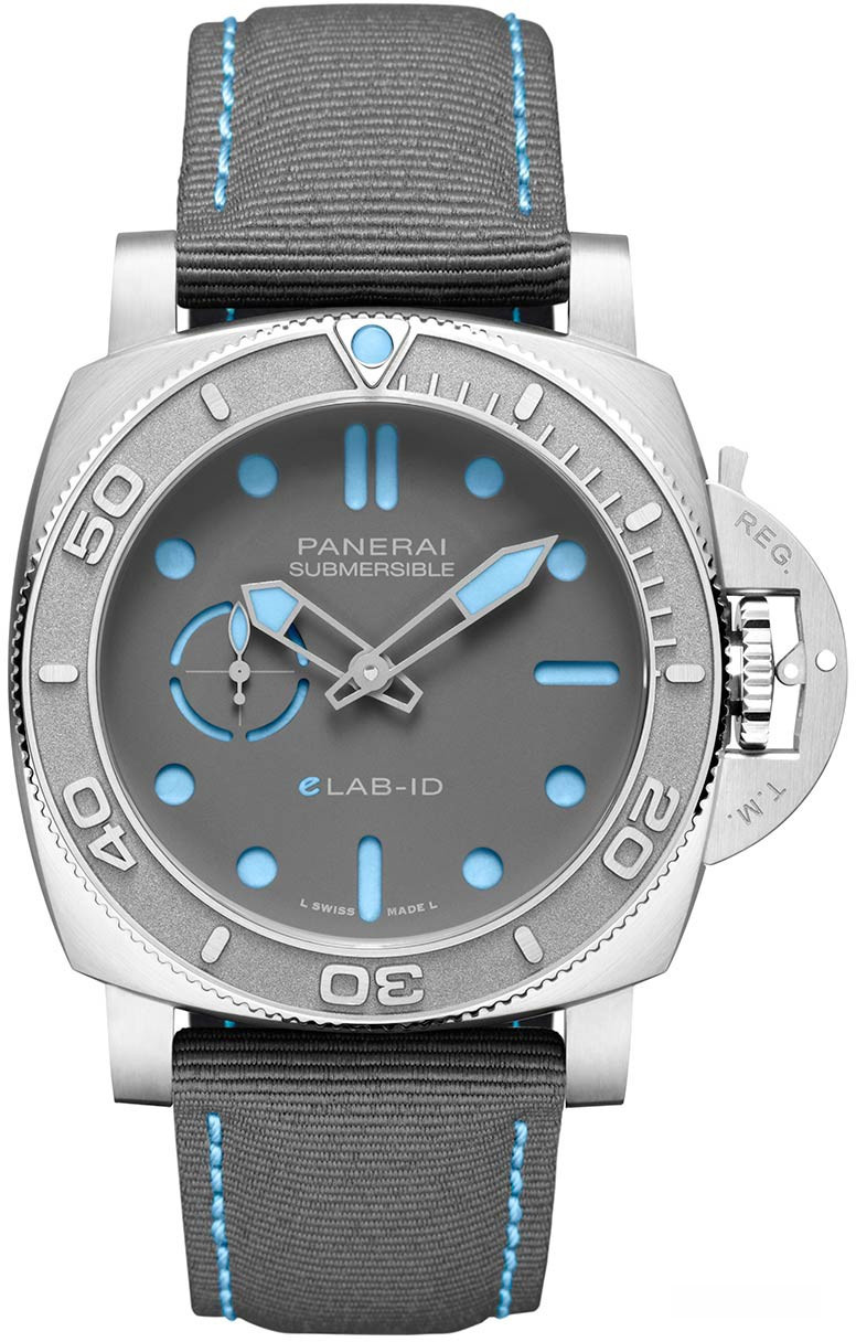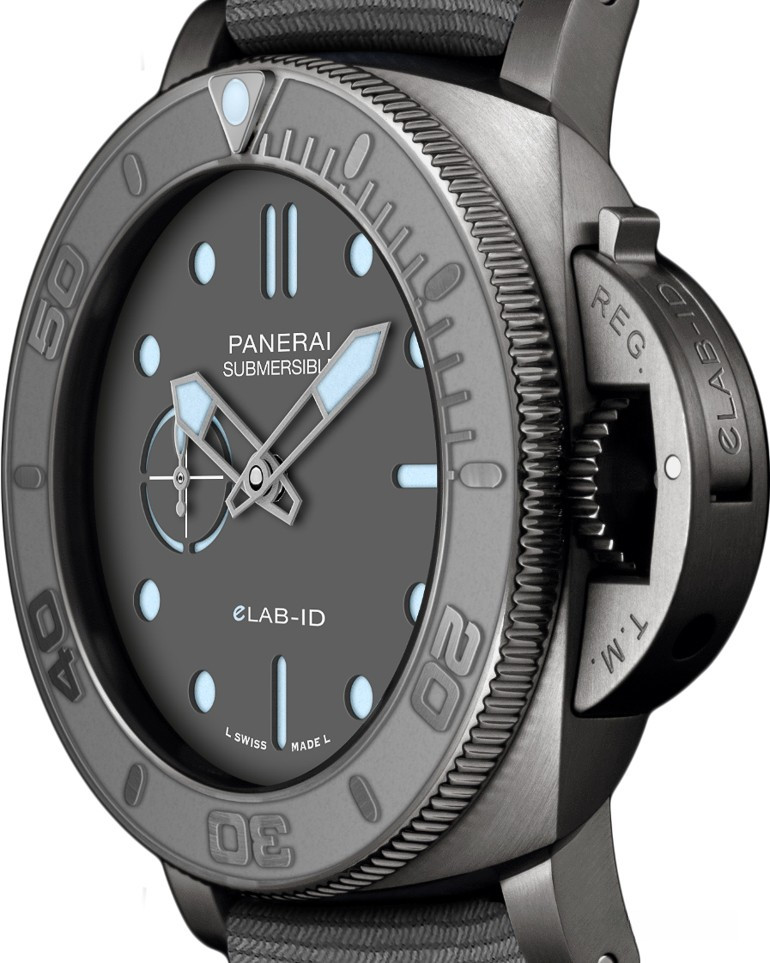 Часы Officine Panerai Submersible eLAB-ID представлены в корпусе из титана размером 44 мм водонепроницаемостью 300 метров. Внутри корпуса установлен автоматический механизм, Калибр Panerai P.900e, обладающий запасом хода 3 дня. На сером циферблате отображаются часы, минуты, секунды. Часы поставляются на текстильном ремешке с титановой вставкой.