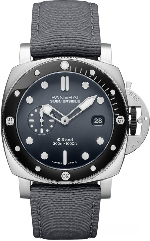 Часы Panerai eSteel Submersible представлены в корпусе из нержавеющей стали и керамики размером 44 мм водонепроницаемостью 300 метров. Внутри корпуса установлен автоматический механизм, Калибр P.900, обладающий запасом хода 72 часа. На сером циферблате отображаются часы, минуты, секунды, дата. Часы комплектуются текстильным ремешком с застежкой из нержавеющей стали.