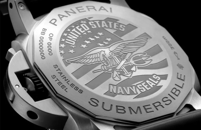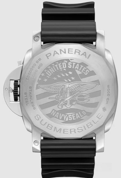 Часы Officine Panerai Submersible GMT Navy SEALs представлены в корпусе размером 44 мм из нержавеющей стали водонепроницаемостью 300 метров. Внутри корпуса установлен автоматический механизм, Калибр P.900/GMT, обладающий запасом хода 3 дня. На сером циферблате отображаются часы, минуты, секунды, дата. Часы поставляются на каучуковом ремешке с застежкой из нержавеющей стали.