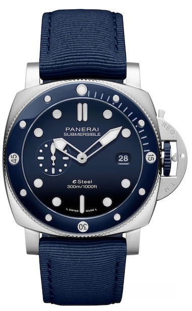 Часы Officine Panerai Submersible QuarantaQuattro представлены в корпусе из нержавеющей стали размером 44 мм водонепроницаемостью 300 метров. Внутри корпуса установлен автоматический механизм, Калибр P.900, обладающий запасом хода 3 дня. На синем циферблате отображаются часы, минуты, секунды, дата. Часы поставляются на текстильном ремешке с застежкой из нержавеющей стали.