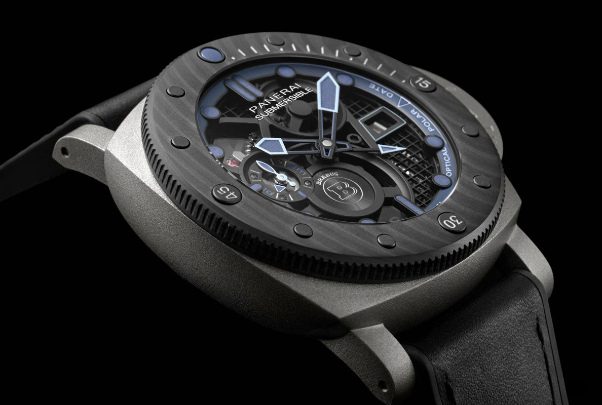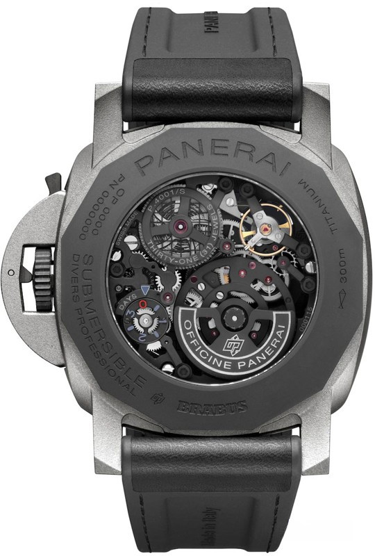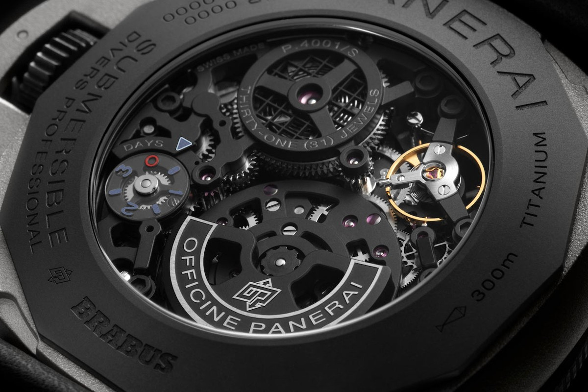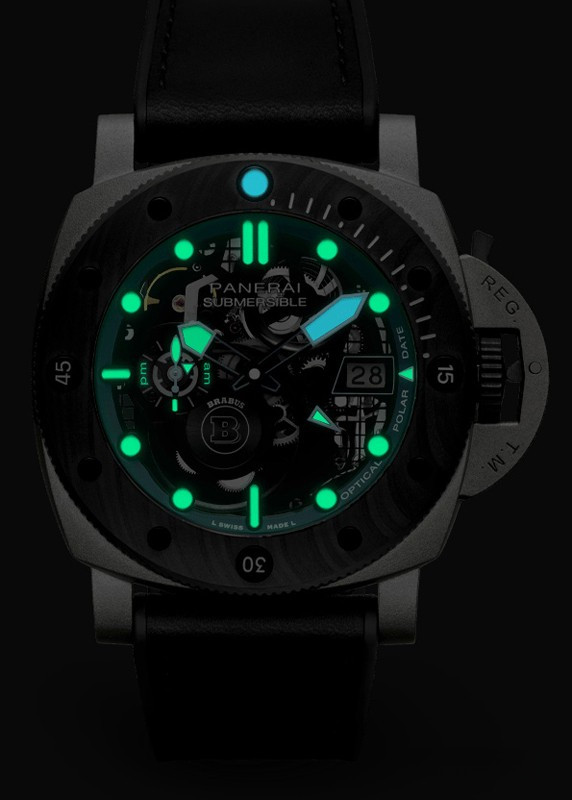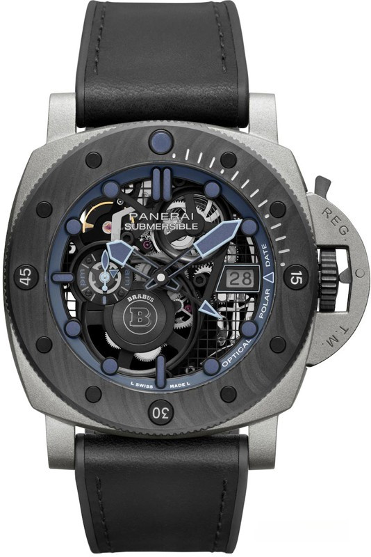 Часы Officine Panerai Submersible S Brabus Blue Shadow Edition представлены в корпусе из титана размером 47 мм водонепроницаемостью 300 метров. Внутри корпуса установлен автоматический механизм, Калибр P.4001/S, обладающий запасом хода 3 дня. На черном циферблате отображаются часы, минуты, секунды, дата, индикатор день/ночь. Часы поставляются на кожаном ремешке с титановой застежкой. Серия огрничена - 200 шт.