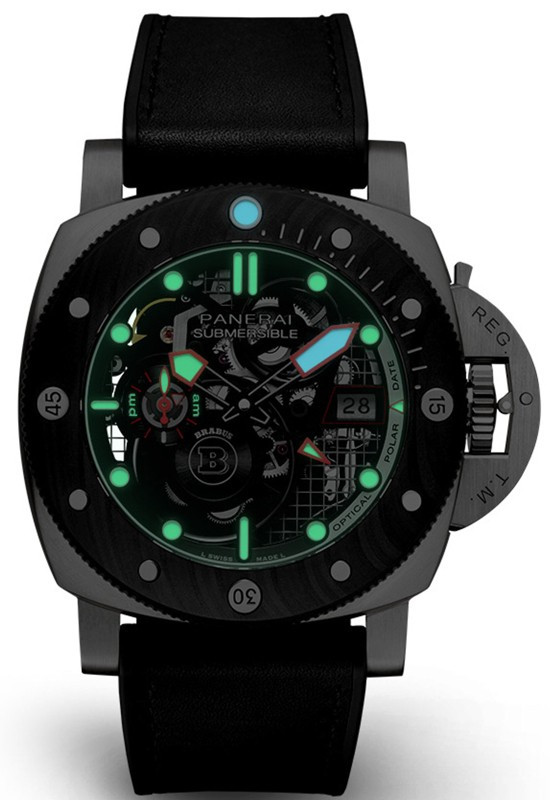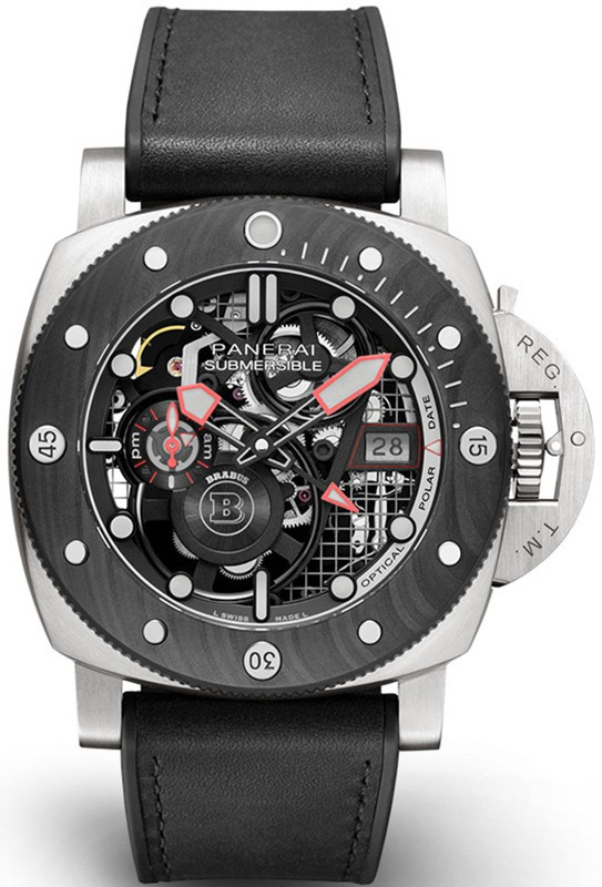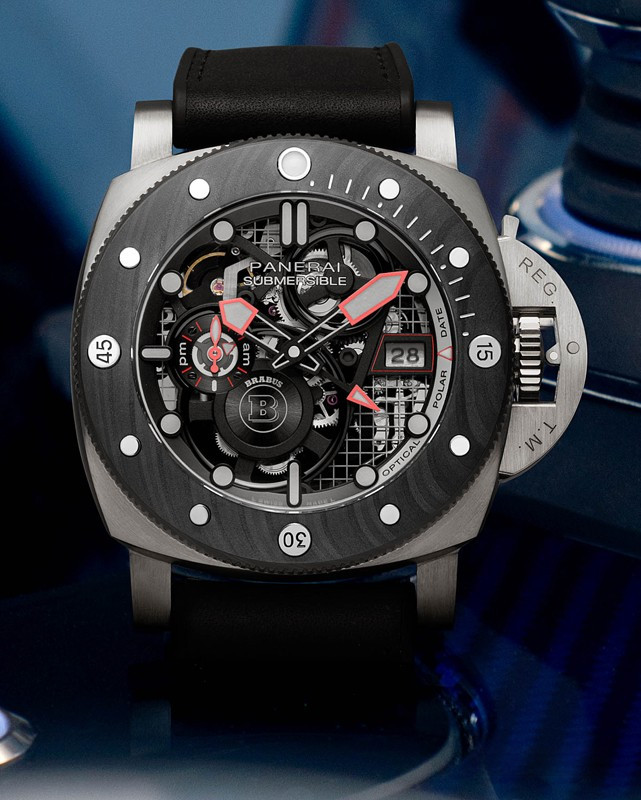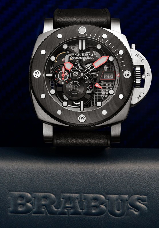 Часы Officine Panerai Submersible S Brabus eTitanio представлены в корпусе размером 47 мм из титана водонепроницаемостью 300 метров. Внутри корпуса установлен автоматический механизм, Калибр P.4001/S, обладающий запасом хода 72 часа. На черном циферблате отображаются часы, минуты, секунды, дата, индикатор день/ночь. Часы поставляются на кожаном ремешке с титановой застежкой. Серия ограничена - 177 шт.