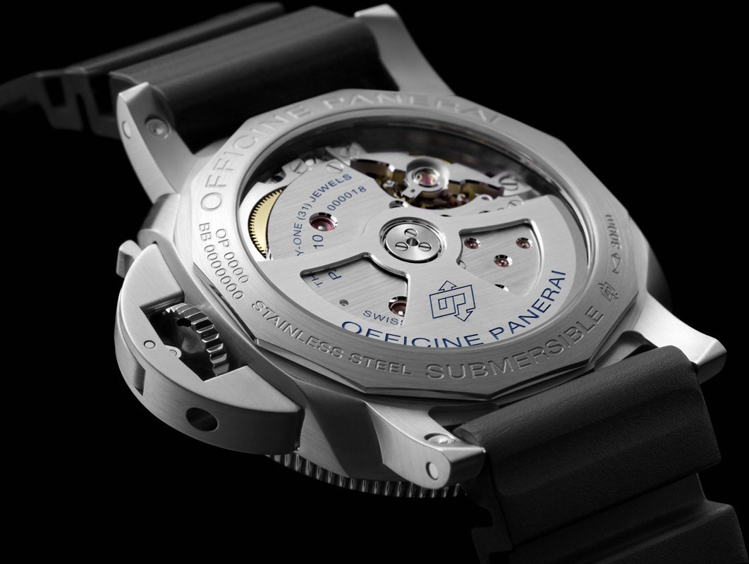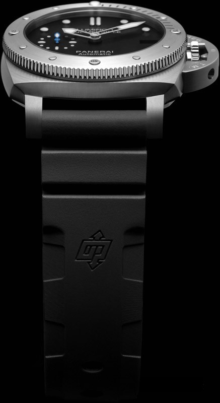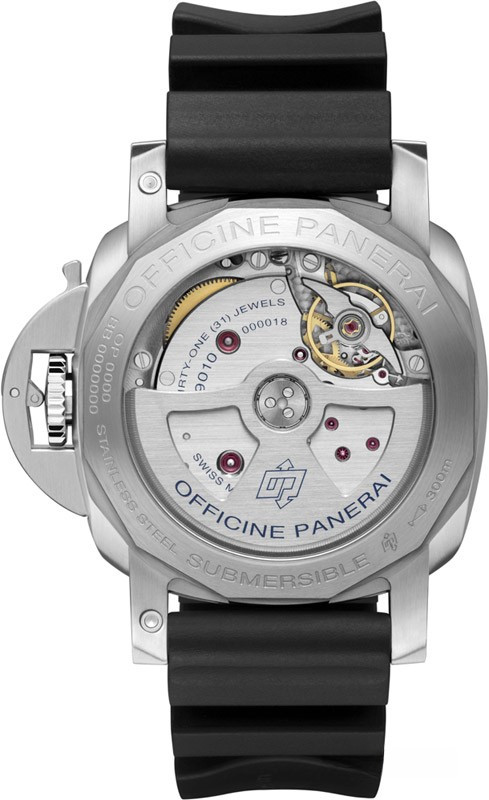 Водостойкие часы Officine Panerai Luminor 1950 Submersible 3 Days Automatic Acciaio выпущены в подушкообразном корпусе из нержавеющей стали. Размер составляет 42 мм, водонепроницаемость 300 м, часы с вращающимся безелем. Внутри корпуса установлен автоматический механизм, Калибр P.9010, обеспечивающий запас хода 3 дня. На черном циферблате отображаются часы, минуты, секунды, дата, расчет времени погружения. Часы и минуты отображаются при помощи центральных стрелок, малая секундная стрелка находится на 9-ти часах, апертура даты - на 3-х. Часы комплектуются каучуковым ремешком с вставкой из нержавеющей стали.