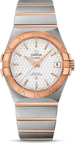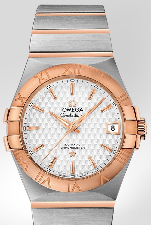 Необычайно эффектный дизайн часов OMEGA Constellation прошел проверку временем. Его характерной особенностью стали знаменитые скобки по бокам часового корпуса и уникальный циферблат. Данная модель имеет серебристый циферблат с рельефным узором в виде ромбов и окошком указателя даты в положении «3 часа». Ее безель из 18-каратного розового золота с выгравированными римскими цифрами закреплен на корпусе диаметром 35 мм из нержавеющей стали, который дополнен браслетом из нержавеющей стали и 18-каратного розового золота. В этой модели используется коаксиальный часовой механизм, калибр 2500, который виден сквозь сапфировое стекло задней крышки корпуса.