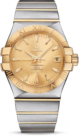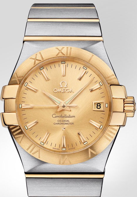 Необычайно эффектный дизайн часов OMEGA Constellation прошел проверку временем. Его характерной особенностью стали знаменитые скобки по бокам часового корпуса и впечатляющие циферблаты. Эта модель имеет циферблат цвета шампанского с окошком указателя даты в положении «3 часа» и устойчивым к царапинам сапфировым стеклом. Безель из 18-каратного желтого золота закреплен на корпусе диаметром 35 мм из нержавеющей стали, который дополнен браслетом из нержавеющей стали и 18-каратного желтого золота. В этой модели используется коаксиальный часовой механизм, калибр 2500, который виден сквозь сапфировое стекло задней крышки корпуса.