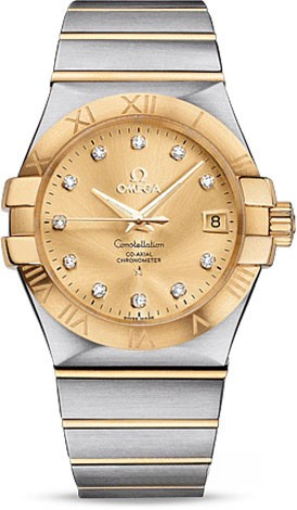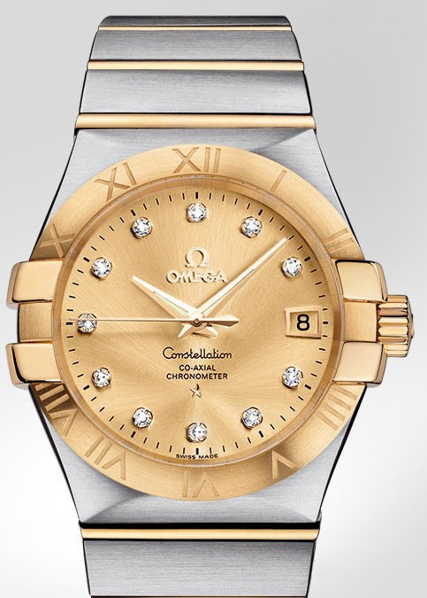 Необычайно эффектный дизайн часов OMEGA Constellation прошел проверку временем. Его характерной особенностью стали знаменитые скобки по бокам часового корпуса и впечатляющие циферблаты. Эта модель имеет украшенный бриллиантовыми часовыми метками циферблат цвета шампанского с окошком указателя даты в положении «3 часа» и устойчивым к царапинам сапфировым стеклом. Безель из 18-каратного желтого золота с выгравированными римскими цифрами закреплен на корпусе диаметром 35 мм из нержавеющей стали, который дополнен браслетом из нержавеющей стали и 18-каратного желтого золота. В этой модели используется коаксиальный часовой механизм, калибр 2500, который виден сквозь сапфировое стекло задней крышки корпуса.