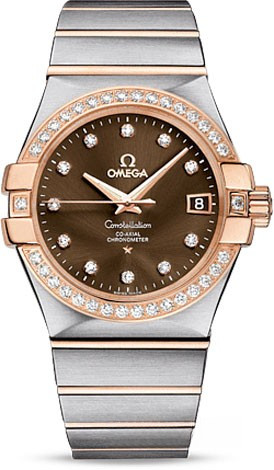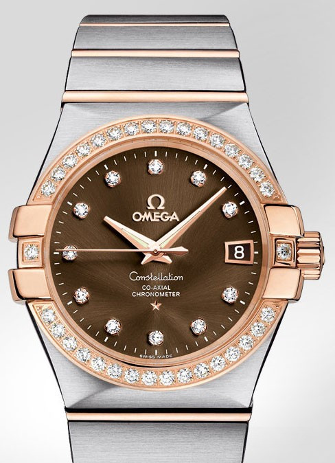 Необычайно эффектный дизайн часов OMEGA Constellation прошел проверку временем. Его характерной особенностью стали знаменитые скобки по бокам часового корпуса и впечатляющие циферблаты. Эта модель имеет украшенный бриллиантовыми часовыми метками коричневый циферблат с окошком указателя даты в положении «3 часа» и устойчивым к царапинам сапфировым стеклом. Украшенный бриллиантами безель из 18-каратного розового золота закреплен на корпусе диаметром 35 мм из нержавеющей стали, который дополнен браслетом из нержавеющей стали и 18-каратного розового золота. В этой модели используется коаксиальный часовой механизм, калибр 2500, который виден сквозь сапфировое стекло задней крышки корпуса.