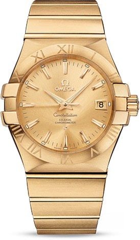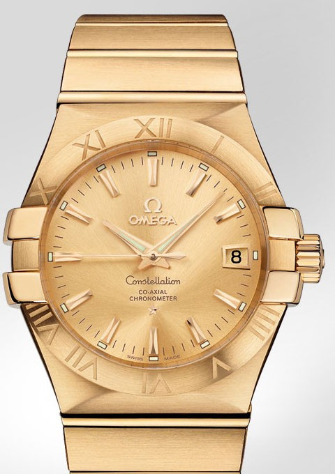Необычайно эффектный дизайн часов OMEGA Constellation прошел проверку временем. Его характерной особенностью стали знаменитые скобки по бокам часового корпуса и впечатляющие циферблаты. Эта модель имеет циферблат цвета шампанского с окошком указателя даты в положении «3 часа» и устойчивым к царапинам сапфировым стеклом. Безель с выгравированными римскими цифрами закреплен на корпусе диаметром 35 мм из 18-каратного желтого золота. Часы дополняет браслет из 18-каратного желтого золота. В этой модели используется коаксиальный часовой механизм, калибр 2500, который виден сквозь сапфировое стекло задней крышки корпуса.