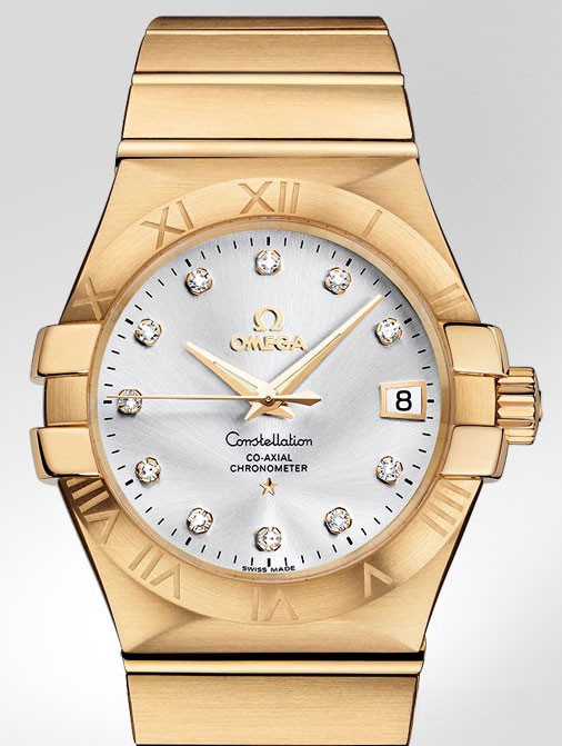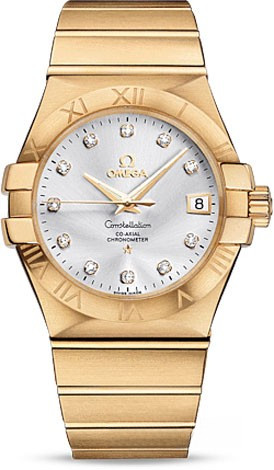 Необычайно эффектный дизайн часов OMEGA Constellation прошел проверку временем. Его характерной особенностью стали знаменитые скобки по бокам часового корпуса и впечатляющие циферблаты. Эта модель имеет украшенный бриллиантовыми часовыми метками серебристый циферблат с окошком указателя даты в положении «3 часа» и устойчивым к царапинам сапфировым стеклом. Безель с выгравированными римскими цифрами закреплен на корпусе диаметром 35 мм из 18-каратного желтого золота. Часы дополняет браслет из 18-каратного желтого золота. В этой модели используется коаксиальный часовой механизм, калибр 2500, который виден сквозь сапфировое стекло задней крышки корпуса.