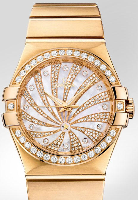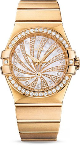 Необычайно эффектный дизайн часов OMEGA Constellation прошел проверку временем. Его характерной особенностью стали знаменитые скобки по бокам часового корпуса и впечатляющие циферблаты. Эта модель имеет циферблат из 18-каратного желтого золота, который украшен узором Supernova, белым перламутром, бриллиантовыми часовыми метками и накрыт устойчивым к царапинам сапфировым стеклом. Украшенный бриллиантами безель закреплен на корпусе диаметром 35 мм из 18-каратного желтого золота, который дополнен браслетом из 18-каратного желтого золота. В этой модели используется коаксиальный часовой механизм, калибр 2403, который виден сквозь прозрачную заднюю крышку корпуса.