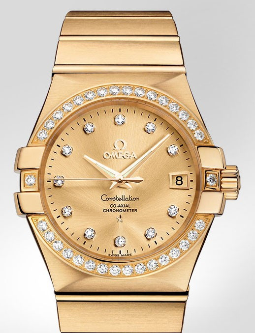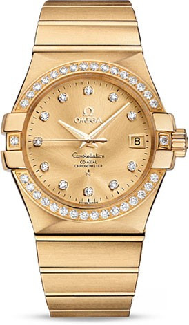 Необычайно эффектный дизайн часов OMEGA Constellation прошел проверку временем. Его характерной особенностью стали знаменитые скобки по бокам часового корпуса и впечатляющие циферблаты. Эта модель имеет украшенный бриллиантовыми часовыми метками циферблат цвета шампанского с окошком указателя даты в положении «3 часа» и устойчивым к царапинам сапфировым стеклом. Украшенный бриллиантами безель закреплен на корпусе диаметром 35 мм из 18-каратного желтого золота, который дополнен браслетом из 18-каратного желтого золота. В этой модели используется коаксиальный часовой механизм, калибр 2500, который виден сквозь сапфировое стекло задней крышки корпуса.