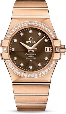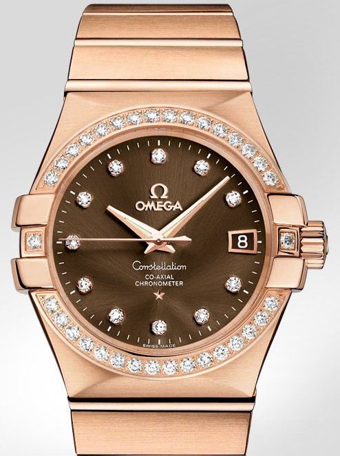 Необычайно эффектный дизайн часов OMEGA Constellation прошел проверку временем. Его характерной особенностью стали знаменитые скобки по бокам часового корпуса и впечатляющие циферблаты. Эта модель имеет украшенный бриллиантовыми часовыми метками коричневый циферблат с окошком указателя даты в положении «3 часа» и устойчивым к царапинам сапфировым стеклом. Украшенный бриллиантами безель закреплен на корпусе диаметром 35 мм из 18-каратного розового золота, который дополнен браслетом из 18-каратного розового золота. В этой модели используется коаксиальный часовой механизм, калибр 2500, который виден сквозь сапфировое стекло задней крышки корпуса.