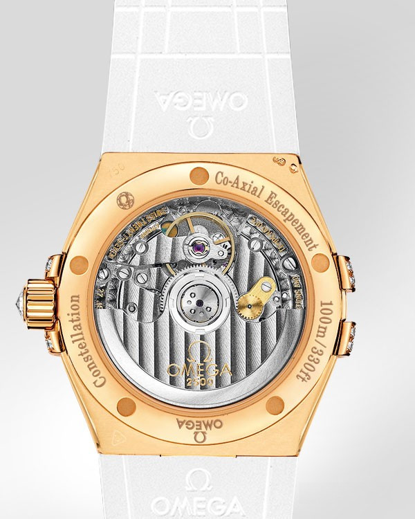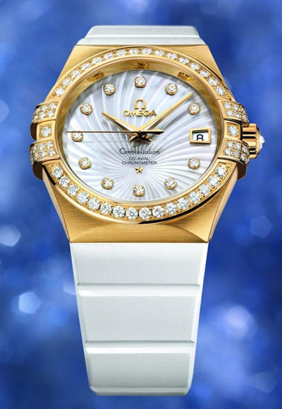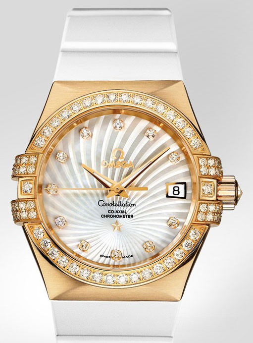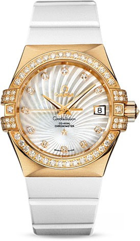 Необычайно эффектный дизайн часов OMEGA Constellation прошел проверку временем. Его характерной особенностью стали знаменитые скобки по бокам часового корпуса и впечатляющие циферблаты. Эта модель имеет белый перламутровый циферблат с узором Supernova, окошком указателя даты в положении «3 часа», бриллиантовыми часовыми метками и устойчивым к царапинам сапфировым стеклом. Украшенный бриллиантами безель с бриллиантами на скобках закреплен на полированном корпусе диаметром 35 мм из 18-каратного желтого золота. Часы дополняет белый каучуковый ремешок. Основу этих часов составляет коаксиальный часовой механизм, калибр 2500, который виден сквозь прозрачную заднюю крышку корпуса.
