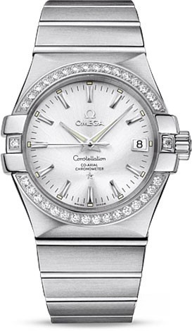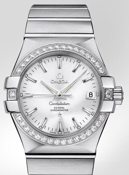 Необычайно эффектный дизайн часов OMEGA Constellation прошел проверку временем. Его характерной особенностью стали знаменитые скобки по бокам часового корпуса и впечатляющие циферблаты. Эта модель имеет серебристый циферблат с окошком указателя даты в положении «3 часа» и устойчивым к царапинам сапфировым стеклом. Украшенный бриллиантами безель закреплен на корпусе диаметром 35 мм из нержавеющей стали, который дополнен стальным браслетом. В этой модели используется коаксиальный часовой механизм, калибр 2500, который виден сквозь сапфировое стекло задней крышки корпуса.