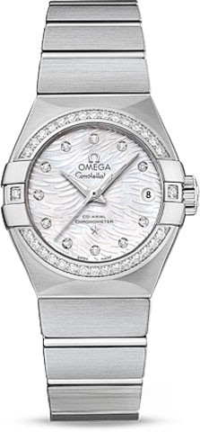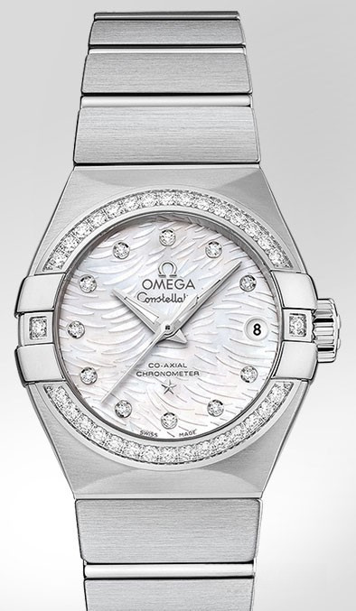 Необычайно эффектный дизайн часов OMEGA Constellation прошел проверку временем. Его характерной особенностью стали знаменитые скобки по бокам часового корпуса и уникальный циферблат. Эта модель имеет гравированный белый перламутровый циферблат с узором из волн. Циферблат насчитывает 11 бриллиантовых часовых меток. В положении «3 часа» находится окошко указателя даты. Безель с бриллиантами закреплен на корпусе диаметром 27 мм из нержавеющей стали, который дополнен стальным браслетом. В часах используется коаксиальный часовой механизм OMEGA, калибр 8520.