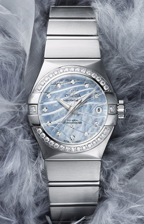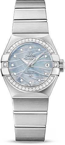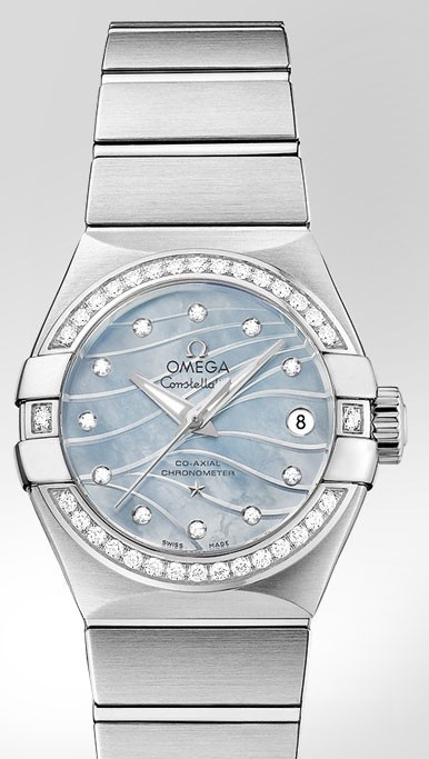 Необычайно эффектный дизайн часов OMEGA Constellation прошел проверку временем. Его характерной особенностью стали знаменитые скобки по бокам часового корпуса и впечатляющие циферблаты. Данная модель имеет гравированный голубой перламутровый циферблат с узором из расходящихся от легендарных скобок волн. Циферблат насчитывает 11 бриллиантовых часовых меток. В положении «3 часа» находится окошко указателя даты. Украшенный бриллиантами безель закреплен на корпусе диаметром 27 мм из нержавеющей стали, который дополнен стальным браслетом. В часах используется коаксиальный часовой механизм OMEGA, калибр 8520.