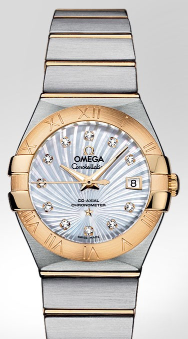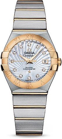 Необычайно эффектный дизайн часов OMEGA Constellation прошел проверку временем. Его характерной особенностью стали знаменитые скобки по бокам часового корпуса и впечатляющие циферблаты. Эта модель имеет белый перламутровый циферблат с узором Supernova и бриллиантовыми часовыми метками, который накрыт устойчивым к царапинам сапфировым стеклом. Безель из 18-каратного желтого золота с выгравированными римскими цифрами закреплен на корпусе диаметром 27 мм из нержавеющей стали, который дополнен браслетом из нержавеющей стали и 18-каратного желтого золота. В этой модели используется коаксиальный часовой механизм OMEGA, калибр 8520, который виден сквозь прозрачную заднюю крышку корпуса.