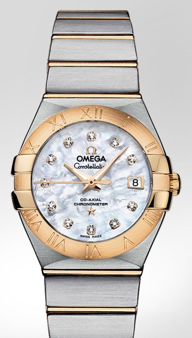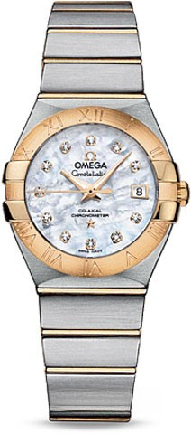 Необычайно эффектный дизайн часов OMEGA Constellation прошел проверку временем. Его характерной особенностью стали знаменитые скобки по бокам часового корпуса и впечатляющие циферблаты. Эта модель имеет белый перламутровый циферблат с бриллиантовыми часовыми метками, который накрыт устойчивым к царапинам сапфировым стеклом. Безель из 18-каратного желтого золота с выгравированными римскими цифрами закреплен на корпусе диаметром 27 мм из нержавеющей стали, который дополнен браслетом из нержавеющей стали и 18-каратного желтого золота. В этой модели используется коаксиальный часовой механизм OMEGA, калибр 8520, который виден сквозь прозрачную заднюю крышку корпуса.