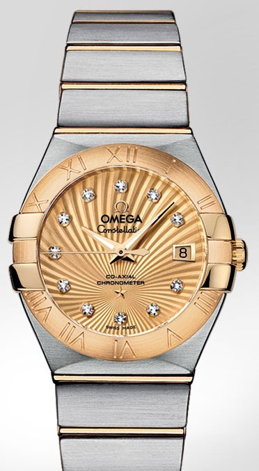 Необычайно эффектный дизайн часов OMEGA Constellation прошел проверку временем. Его характерной особенностью стали знаменитые скобки по бокам часового корпуса и впечатляющие циферблаты. Эта модель имеет циферблат цвета шампанского с узором Supernova и бриллиантовыми часовыми метками, который накрыт устойчивым к царапинам сапфировым стеклом. Безель из 18-каратного желтого золота с выгравированными римскими цифрами закреплен на корпусе диаметром 27 мм из нержавеющей стали, который дополнен браслетом из нержавеющей стали и 18-каратного желтого золота. В этой модели используется коаксиальный часовой механизм OMEGA, калибр 8520, который виден сквозь прозрачную заднюю крышку корпуса.