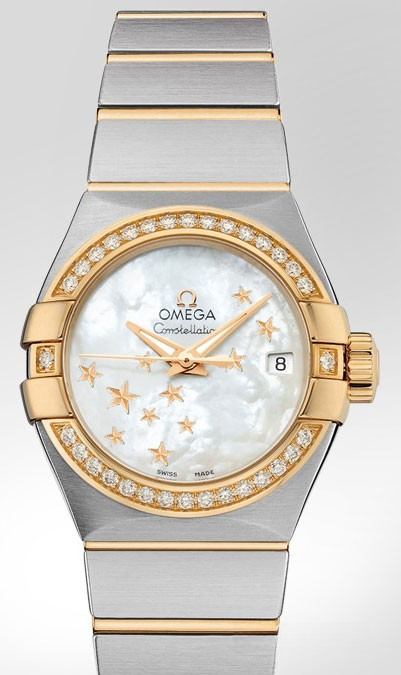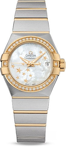 Необычайно эффектный дизайн часов OMEGA Constellation прошел проверку временем. Его характерной особенностью стали знаменитые скобки по бокам часового корпуса и впечатляющие циферблаты. Эта модель имеет белый перламутровый циферблат с россыпью накладных позолоченных звезд, который накрыт устойчивым к царапинам сапфировым стеклом. Украшенный бриллиантами безель из 18-каратного желтого золота закреплен на корпусе диаметром 27 мм из нержавеющей стали, который дополнен браслетом из нержавеющей стали и 18-каратного желтого золота. Основу этих часов составляет коаксиальный часовой механизм OMEGA, калибр 8520, который виден сквозь прозрачную заднюю крышку корпуса.