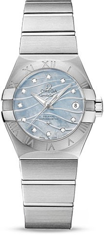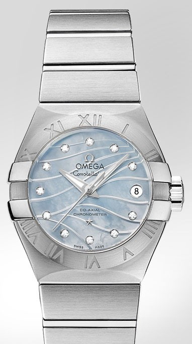 Необычайно эффектный дизайн часов OMEGA Constellation прошел проверку временем. Его характерной особенностью стали знаменитые скобки по бокам часового корпуса и впечатляющие циферблаты. Данная модель имеет гравированный голубой перламутровый циферблат с узором из расходящихся от легендарных скобок волн. Циферблат насчитывает 11 бриллиантовых часовых меток. В положении «3 часа» находится окошко указателя даты. Безель с выгравированными римскими цифрами закреплен на корпусе диаметром 27 мм из нержавеющей стали, который дополнен стальным браслетом. В часах используется коаксиальный часовой механизм OMEGA, калибр 8520.
