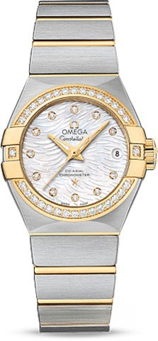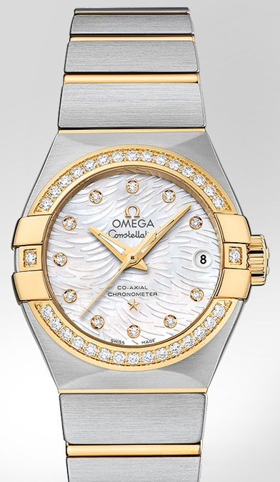 Необычайно эффектный дизайн часов OMEGA Constellation прошел проверку временем. Его характерной особенностью стали знаменитые скобки по бокам часового корпуса и уникальный циферблат. Эта модель имеет гравированный белый перламутровый циферблат с узором из волн. Циферблат насчитывает 11 бриллиантовых часовых меток. В положении «3 часа» находится окошко указателя даты. Безель из 18-каратного желтого золота с бриллиантами закреплен на корпусе диаметром 27 мм из нержавеющей стали, который дополнен стальным браслетом с соединительными элементами из 18-каратного золота. В часах используется коаксиальный часовой механизм OMEGA, калибр 8520.