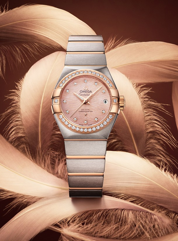 Часы Pluma Automatic Date 27 mm имеют розовый жемчужный гильошированный циферблат со стрелками из 18-каратного розового золота, покрытыми люминофором Super-LumiNova. Безель часов инкрустирован белыми бриллиантами. Сатинированный и полированный корпус диаметром 27 мм из нержавеющей стали и розового золота 18к дополняет браслет из нержавеющей стали и розового золота 18к. Апертура даты расположена на 3-х часах. 11 белых бриллиантов расположены на местах часовых меток. Внутри корпуса установлен автоматический механизм Omega 8520 с запасом хода 50 часов. Часы являются официальным хронометром COSC. Водонепроницаемость корпуса до 100 метров.