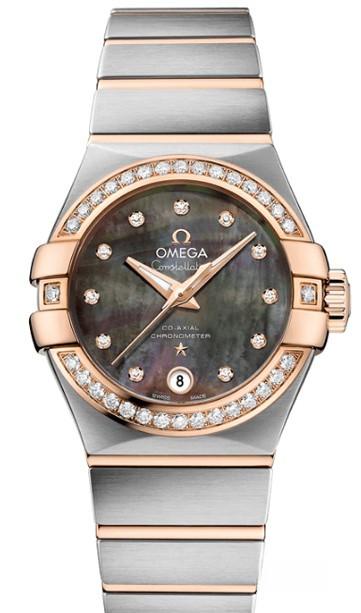 Названная в честь небесных светил коллекция Constellation с 1952 года является символом роскоши. При создании этой серии мастера OMEGA обратились не только к темам неба, но и морских глубин: циферблаты часов изготовлены из перламутра с острова Таити. Циферблат модели диаметром 27 мм украшен 11 бриллиантовыми часовыми метками в оправе из 18-каратного розового золота, которая идеально сочетается с полированными гранеными стрелками. К уникальным отличиям модели также относится окошко указателя даты в положении "6 часов". Корпус и браслет изготовлены из нержавеющей стали и 18-каратного розового золота. Ставшие характерной особенностью коллекции Constellation знаменитые скобки расположены на украшенном бриллиантами безеле. В модели используется коаксиальный часовой механизм OMEGA, калибр 8520, который виден сквозь выполненную из сапфирового стекла заднюю крышку корпуса.
