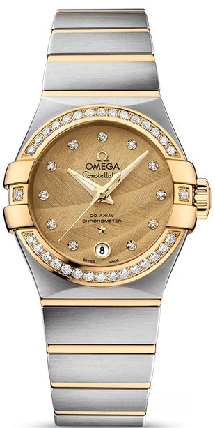 Необычайно эффектный дизайн часов OMEGA Constellation прошел проверку временем. Его характерной особенностью стали знаменитые скобы по бокам часового корпуса и впечатляющие циферблаты. Эта модель имеет матовый лаковый циферблат цвета шампанского с перистым узором. Циферблат насчитывает 11 бриллиантовых часовых меток. В положении "6 часов" находится окошко указателя даты. Украшенный бриллиантами безель из 18-каратного желтого золота закреплен на корпусе диаметром 27 мм из нержавеющей стали, который дополнен стальным браслетом с соединительными элементами из 18-каратного желтого золота. В часах используется коаксиальный часовой механизм OMEGA, калибр 8520.