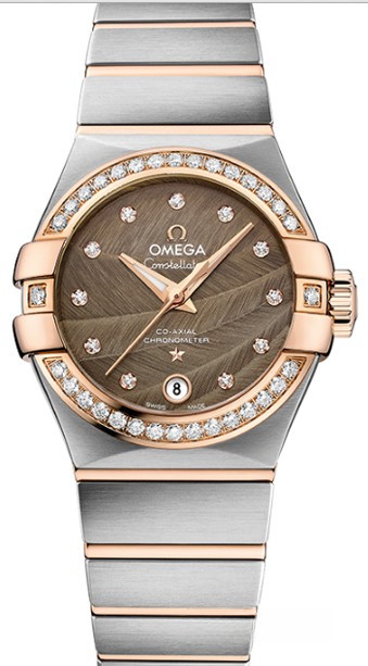 Необычайно эффектный дизайн часов OMEGA Constellation прошел проверку временем. Его характерной особенностью стали знаменитые скобы по бокам часового корпуса и уникальный циферблат. Эта модель имеет лаковый циферблат цвета пралине с перистым узором. Циферблат насчитывает 11 бриллиантовых часовых меток. В положении "6 часов" находится окошко указателя даты. Украшенный бриллиантами безель из 18-каратного розового золота закреплен на корпусе диаметром 27 мм из нержавеющей стали, который дополнен стальным браслетом с соединительными элементами из 18-каратного розового золота. В часах используется коаксиальный часовой механизм OMEGA, калибр 8520.