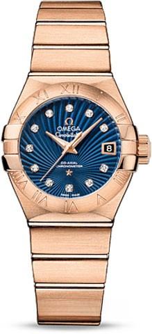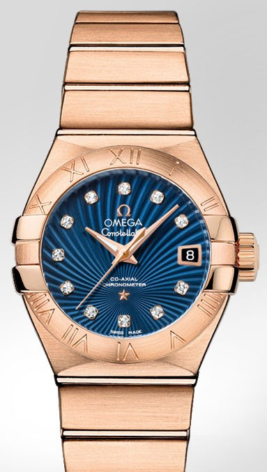 Необычайно эффектный дизайн часов OMEGA Constellation прошел проверку временем. Его характерной особенностью стали знаменитые скобки по бокам часового корпуса и впечатляющие циферблаты. Данная модель имеет синий циферблат с узором Supernova, 11 бриллиантовыми часовыми метками и окошком указателя даты в положении «3 часа». Безель с выгравированными римскими цифрами закреплен на корпусе диаметром 27 мм из 18-каратного розового золота, который дополнен таким же золотым браслетом. В этой модели используется коаксиальный часовой механизм, калибр 8521, который виден сквозь сапфировое стекло задней крышки корпуса.