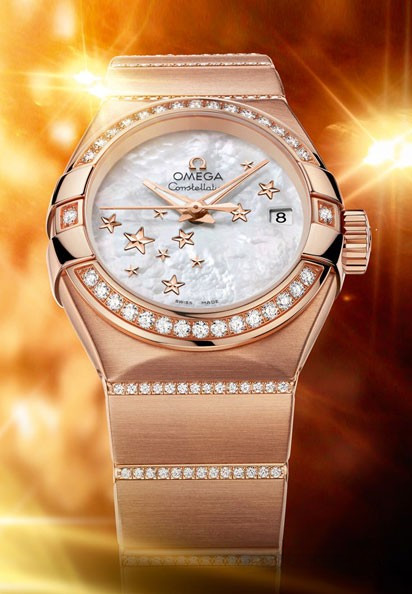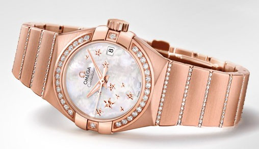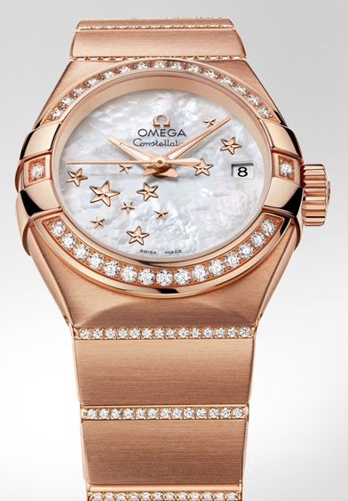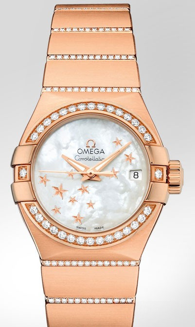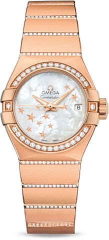 Необычайно эффектный дизайн часов OMEGA Constellation прошел проверку временем. Его характерной особенностью стали знаменитые скобки по бокам часового корпуса и впечатляющие циферблаты. Эта модель имеет белый перламутровый циферблат с россыпью накладных звезд из 18-каратного золота, который накрыт устойчивым к царапинам сапфировым стеклом. Украшенный бриллиантами безель закреплен на корпусе диаметром 27 мм из 18-каратного розового золота, который дополнен браслетом из 18-каратного розового золота. В этой модели используется коаксиальный часовой механизм OMEGA, калибр 8521, который виден сквозь прозрачную заднюю крышку корпуса.