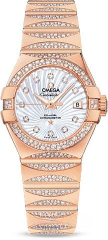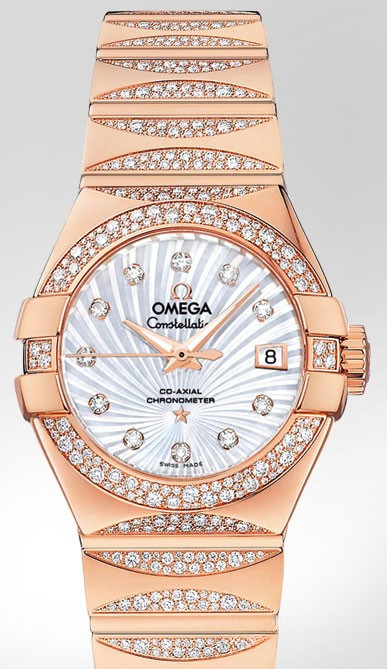 Необычайно эффектный дизайн часов OMEGA Constellation прошел проверку временем. Его характерной особенностью стали знаменитые скобки по бокам часового корпуса и впечатляющие циферблаты. Эта полированная модель имеет белый перламутровый циферблат с узором Supernova и бриллиантовыми часовыми метками, который накрыт устойчивым к царапинам сапфировым стеклом. Безель с паве из разноразмерных бриллиантов закреплен на корпусе диаметром 27 мм из 18-каратного розового золота. Часы дополняет браслет из 18-каратного розового золота с бриллиантовыми паве линзообразной формы на звеньях. Основу этих часов составляет коаксиальный часовой механизм OMEGA, калибр 8521, который виден сквозь прозрачную заднюю крышку корпуса.