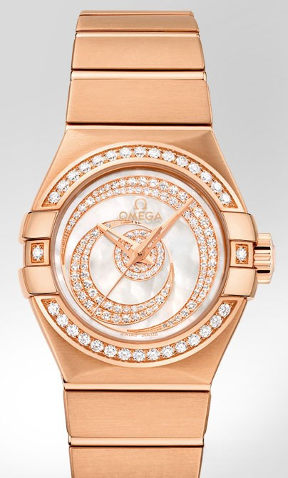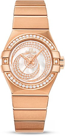 Необычайно эффектный дизайн часов OMEGA Constellation прошел проверку временем. Его характерной особенностью стали знаменитые скобки по бокам часового корпуса и впечатляющие циферблаты. Эта роскошная модель имеет циферблат из 18-каратного розового золота, который акцентирован белым перламутром с жемчужным узором и 126 бриллиантами, выложенными в форме месяцев. Безель с бриллиантовым паве закреплен на корпусе диаметром 27 мм из 18-каратного розового золота, который дополнен таким же золотым браслетом. В этой модели используется коаксиальный часовой механизм OMEGA, калибр 8421, который виден сквозь прозрачную заднюю крышку корпуса.